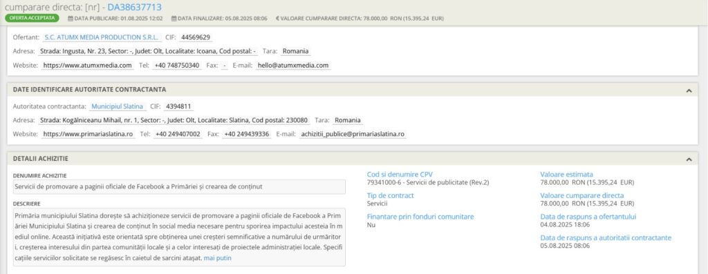 Ce trebuie să facă în schimbul acestor bani? Potrivit anunţului de pe site-ul de achiziţii publice: „Prestez servicii de promovare pagini pentru platformele de Social Media, creez grafica foto, video și text pentru platformele de Social Media”.