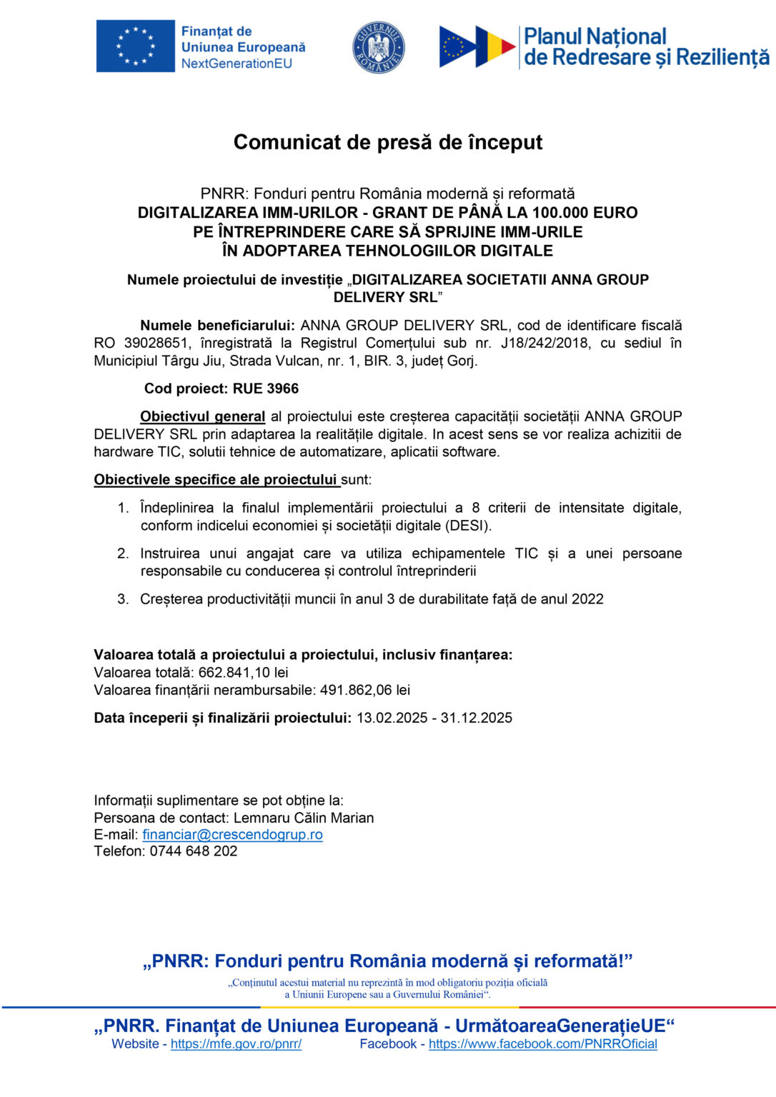 Comunicat de presă de început al proiectului de investiție „DIGITALIZAREA SOCIETĂȚII ANNA GROUP DELIVERY SRL”