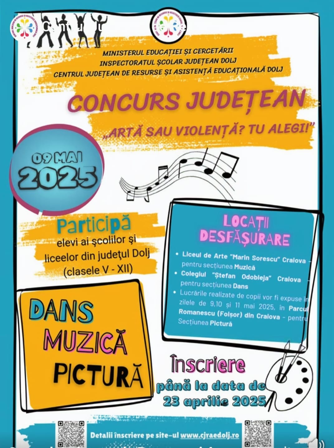 Tot in cadrul actiunilor de prevenire a violentei din mediul scolar Centrul Județean de Resurse și Asistență Educațională Dolj în parteneriat cu Inspectoratul Școlar Județean DOLJ organizează, în data de 09 Mai 2025, ????????? ?????̦??? “????̆ ??? ???????̧?̆? ?? ?????!” – concurs de interpretare muzicală, dans și pictură.