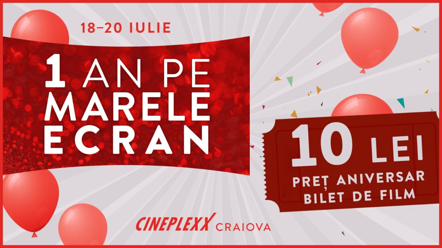 Cineplexx Craiova, cinematograful din incinta Promenada Mall, sărbătorește primul an de la deschidere și îi invită pe toți iubitorii de filme să marcheze împreună acest moment special. Pentru a celebra aniversarea, în perioada 18-20 iulie, cinefilii pot viziona orice film din program la un preț aniversar de doar 10 lei.