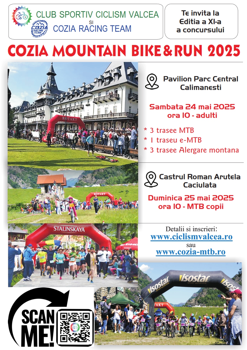 Clubul Sportiv Ciclism Vâlcea și Cozia Racing Team organizează cea de-a XI-a ediție a concursului Cozia Mountain Bike & Run, un eveniment sportiv spectaculos desfășurat în inima naturii, la poalele Munților Cozia!