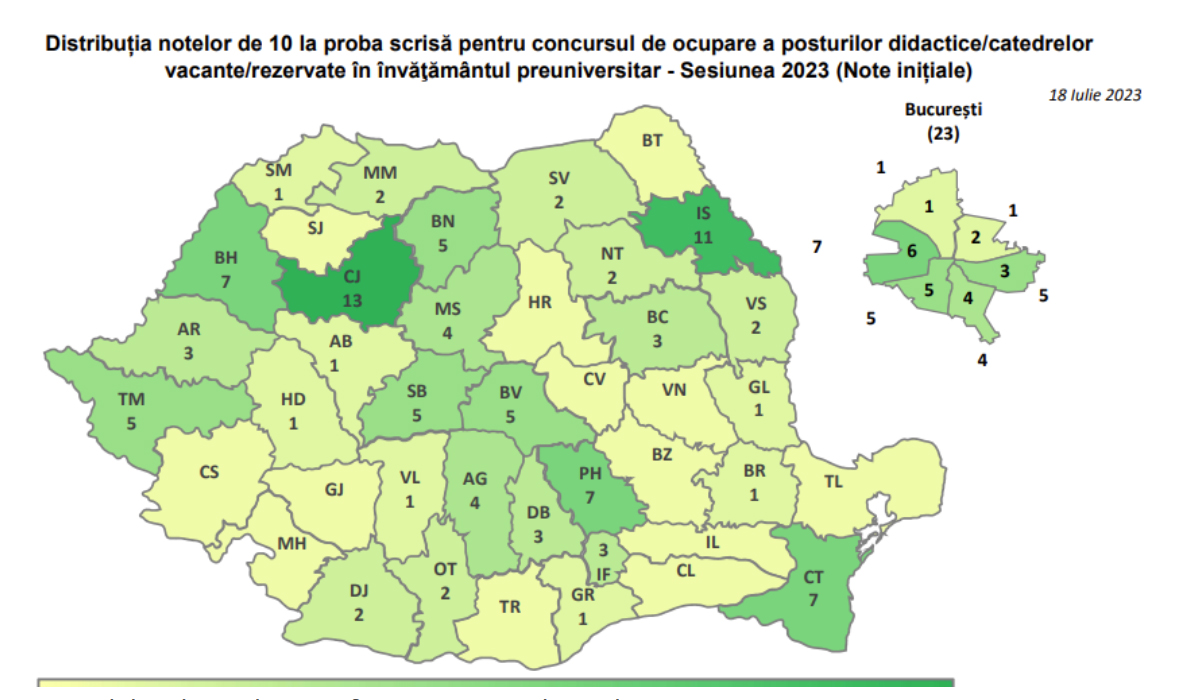 • Rata notelor peste 7 (șapte) obținute de candidații care au susținut proba scrisă este de 42,93%  (164 de candidați). Un candidat a obținut nota 10, iar 163 de candidați au obținut note între 7 și 9,99;