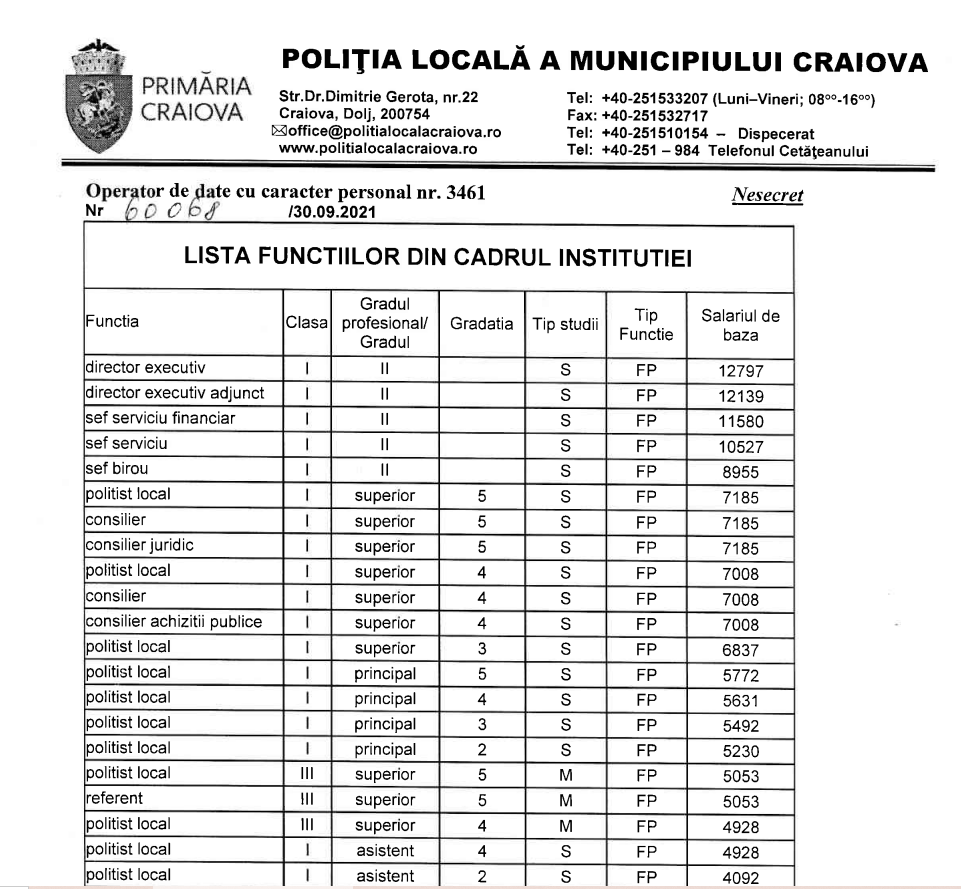 Potrivit listei cu funcțiile din cadrul Poliției Locale Craiova, din data de 30.09.2021, directorul executiv Octavian Mateescu are un salariu de bază care se ridică la suma de 12.797 lei, bani publici. Nici salariile angajaților ce ar trebui să cunoască și să ofere anumite informații nu sunt tocmai mici.