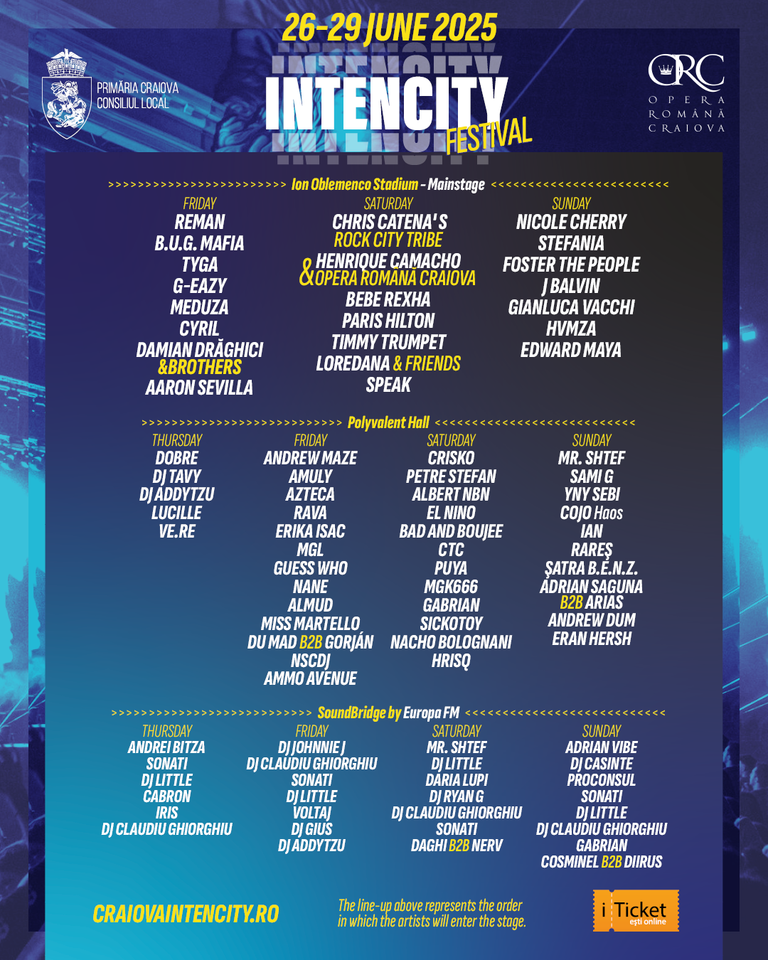 IntenCity 2025 oferă patru zile de muzică live și superproducții care transformă Craiova într-un punct fierbinte pe harta marilor festivaluri europene. Cu staruri internaționale, artiști români de top și zeci de mii de fani entuziaști, IntenCity nu este doar un festival, ci o destinație muzicală unică și o comunitate cu o energie de neratat.