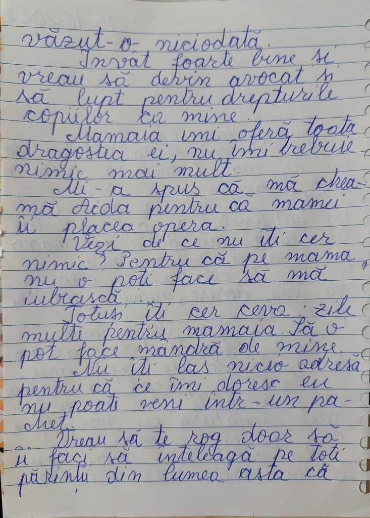 Am aflat că mai am o surioară, dar nu am văzut-o niciodată. Învăț foarte bine și vreau să devin avocat și să lupt pentru drepturile copiilor ca mine. Mamaia îmi oferă toată dragostea ei, nu îmi trebuie nimic mai mult.