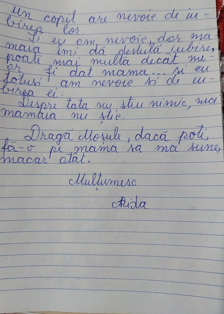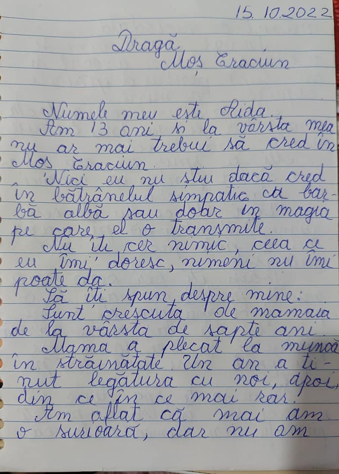 Aida, o fetiță de doar 13 ani, rămasă în grija bunicii după ce mama ei a plecat în străinătate, i-a scris lui Moș Crăciun o scrisoare de-a dreptul sfâșietoare. Doar că, spre deosebire de alți copii, ea nu a cerut dulciuri sau cadouri, ci doar zile multe pentru bunica sa, pentru a o vedea crescând mare și să fie mândră de ea.