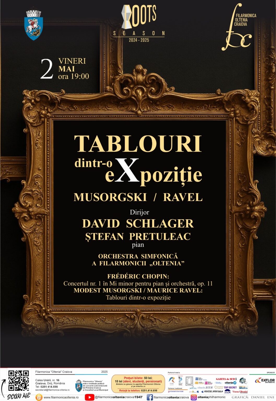 Vineri, 2 mai, de la ora 19:00, artiștii Filarmonicii „Oltenia” Craiova invită publicul la o seară specială, cu un program care combină muzica de mare sensibilitate cu o poveste inspirată din artă. Concertul va include lucrări de Chopin și Musorgski, în interpretarea unor artiști remarcabili.