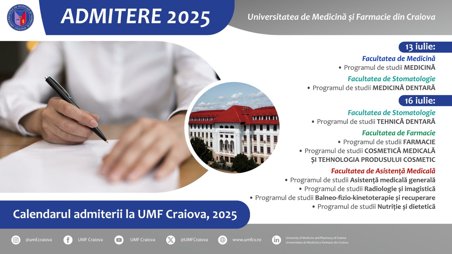 Candidații sunt invitați să consulte toate detaliile pe site-ul oficial al universității: www.umfcv.ro, la secțiunea Admitere, unde pot găsi informații complete despre înscriere, locuri, tematică, bibliografie și regulamentul admiterii.