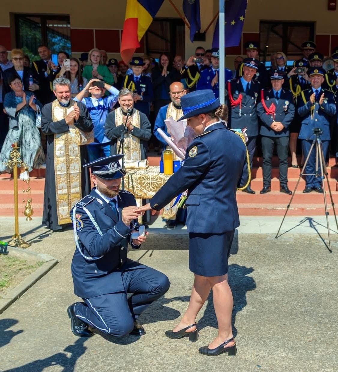 George, polițist la Secția 1 Craiova, a ales să își declare iubirea într-un mod cu totul special: în uniformă, în cadrul ceremoniei de absolvire a promoției agenților de penitenciar, unde iubita sa, Ștefania, depunea jurământul de credință. În fața drapelului și a colegilor, George i-a adresat întrebarea crucială: „Ștefania, vrei să fii soția mea?”, primind un „DA” plin de emoție. Uniforma i-a unit prin valori profesionale, dar ceea ce îi leagă dincolo de acestea este iubirea.