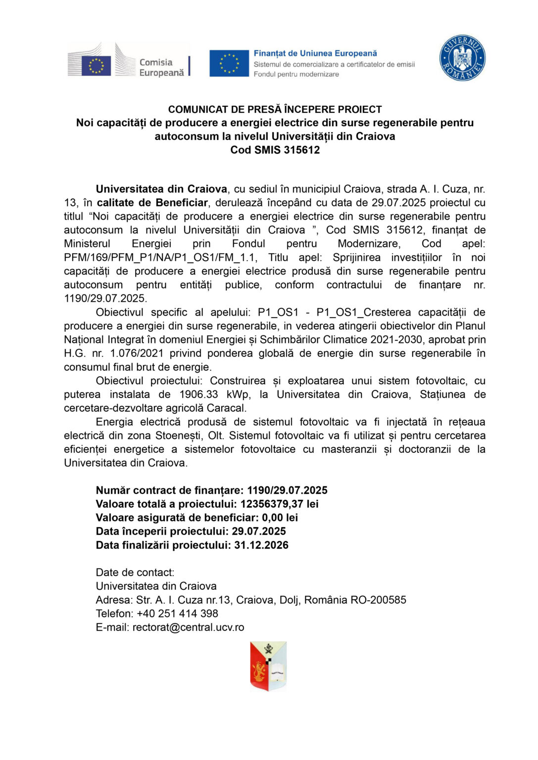 Universitatea din Craiova, cu sediul în municipiul Craiova, strada A. I. Cuza, nr. 13, în calitate de Beneficiar, derulează începând cu data de 29.07.2025 proiectul cu titlul “Noi capacități de producere a energiei electrice din surse regenerabile pentru autoconsum la nivelul Universității din Craiova ”, Cod SMIS 315612, finanțat de Ministerul Energiei prin Fondul pentru Modernizare, Cod apel: PFM/169/PFM_P1/NA/P1_OS1/FM_1.1, Titlu apel: Sprijinirea investițiilor în noi capacități de producere a energiei electrice produsă din surse regenerabile pentru autoconsum pentru entități publice, conform contractului de finanțare nr. 1190/29.07.2025.