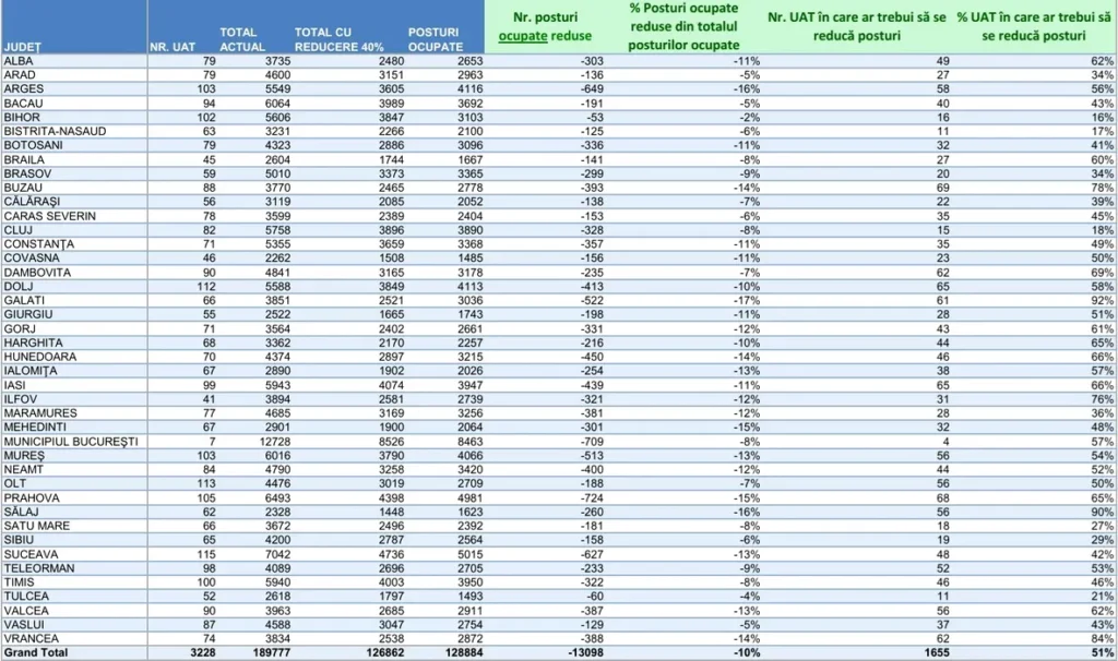 Guvernul României a transmis o analiză care arată câte posturi ar urma să fie desfiinţate din fiecare judeţ şi din fiecare localitate a ţării, dacă pachetul privind reforma administraţiei publice ar fi aprobată.