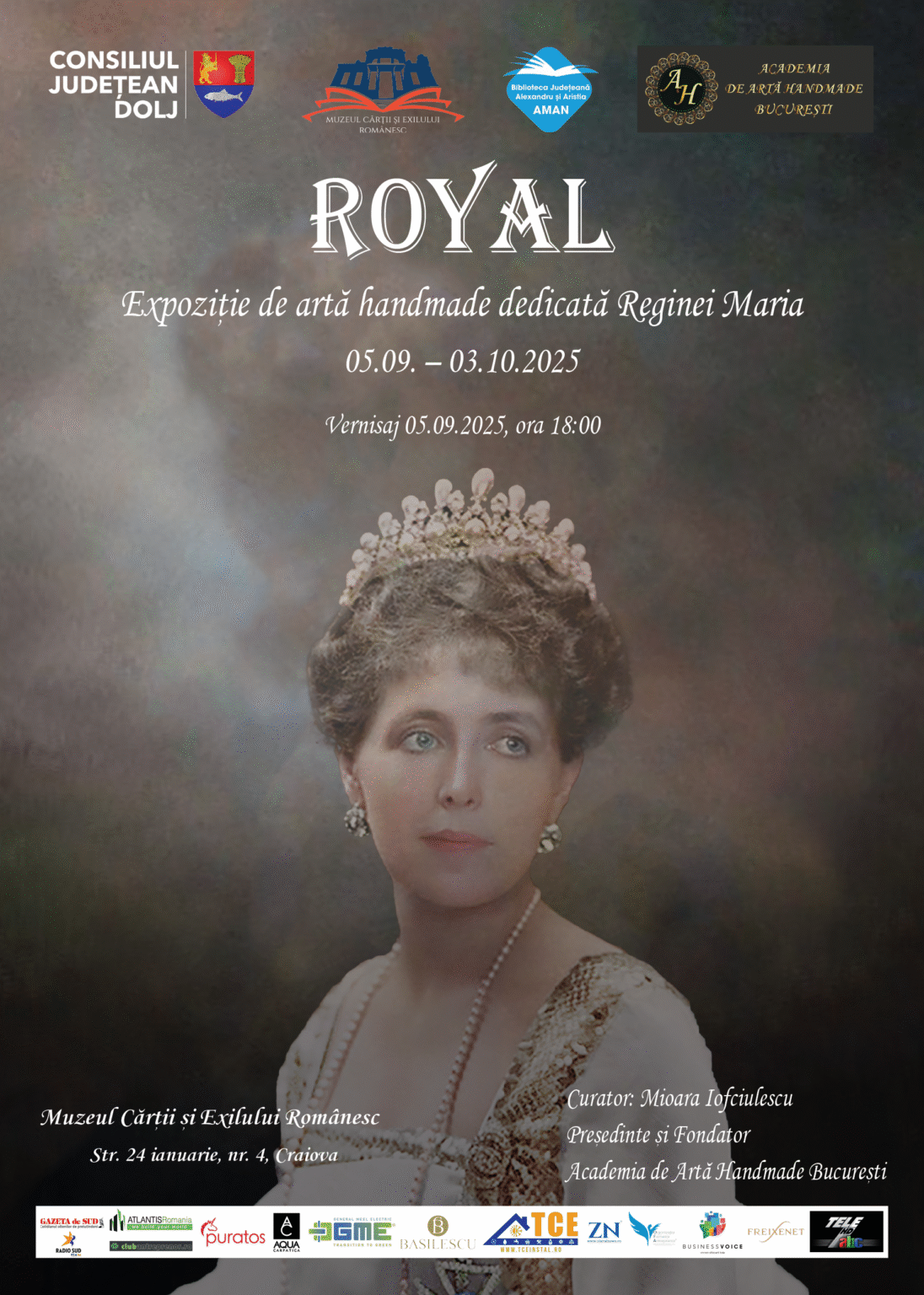 „După succesul extraordinar de care s-a bucurat ca urmare a premierei din luna iulie, de la Muzeul Național al Literaturii Române din București, mii de turiști au putut să admire expoziția în cursul lunii august, la Castelul Balcic din Bulgaria, Craiova fiind următoarea destinație a turneului național și internațional propus de organizatori. ROYAL este un concept expozițional unic, dezvoltat în jurul colecției vestimentare “Regina Maria”, semnată de designerul Mioara Iofciulescu, originară din Craiova, care include o suită de rochii și costume tradiționale ce evocă spiritul regal, distincția și noblețea reginei, atașamentul acesteia față de poporul român și puternicul simț al responsabilității și al datoriei cu care a reprezentat interesele României la cel mai înalt nivel. Având ca inspirație grădinile Castelului Balcic, artista a mai creat o colecție de flori modelate manual din pastă de porțelan, dar și prima sa colecție de artă grafică, sub îndrumarea academicianului Mircia Dumitrescu”, conform reprezentanților Bibliotecii „Aman”.