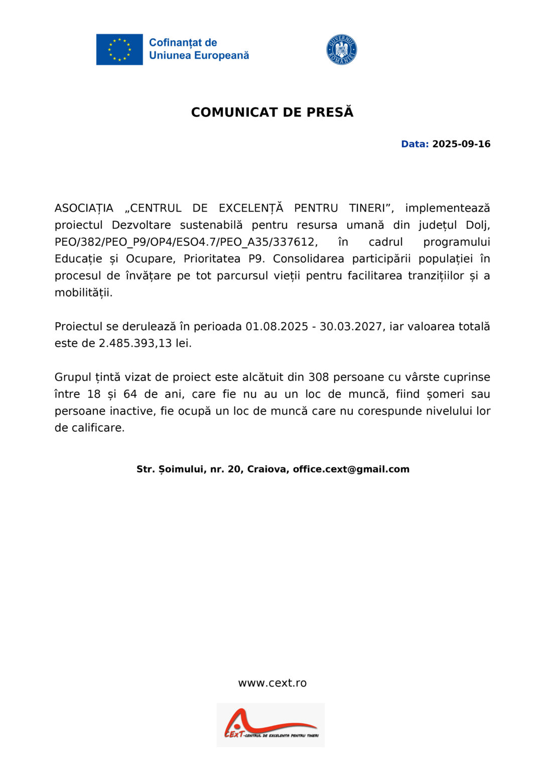 AnunturiComunicat de presă – implementare proiect „Dezvoltare sustenabilă pentru resursa umană din județul Dolj” Jurnalul Olteniei 16 septembrie 2025 Share SHARE Jurnalul Olteniei See Full Bio Distribuie acest articol Facebook Whatsapp Whatsapp Email Copy Link Print Articolul precedent Comunicat de presă – implementare proiect „Integrare socială și profesională pentru persoanele cu nivel scăzut de formare” Articolul următor Comunicat de presă – implementare proiect „Promovarea învățării pe tot parcursul vieții în rândul persoanelor cu nivel scăzut de educație sau fără educație” Ultima ora Se știe grupa în care poate juca România la Cupa Mondială din 2026 5 decembrie 2025 Dolj: Ajutoare sociale de peste 76 milioane lei 5 decembrie 2025 Cea de-a VII-a ediție a Semimaratonului Craiovei a avut loc sâmbătă, 18 octombrie 2025. 5 decembrie 2025 ANUNT PRIVIND ORGANIZAREA ACHIZITIEI DE UTILAJE . MINIEXCAVATOR – LOTUL 1, UTILAJ DE FORAT HIDRAULIC – LOTUL 2 – RELUATÃ 2 5 decembrie 2025 Modernizarea CF Filiași: Începe proiectarea 5 decembrie 2025 Testare gratuită HPV la Spitalul Județean Târgu Jiu 5 decembrie 2025 CE Oltenia raportează emisii scăzute de dioxid de carbon 5 decembrie 2025 DIICOT a destructurat un grup de proxenetism în Mehedinți 5 decembrie 2025 Legea pensiilor magistraților, atacată, din nou, la CCR 5 decembrie 2025 Magia Crăciunului Târgu Jiu: Seară de neuitat 5 decembrie 2025