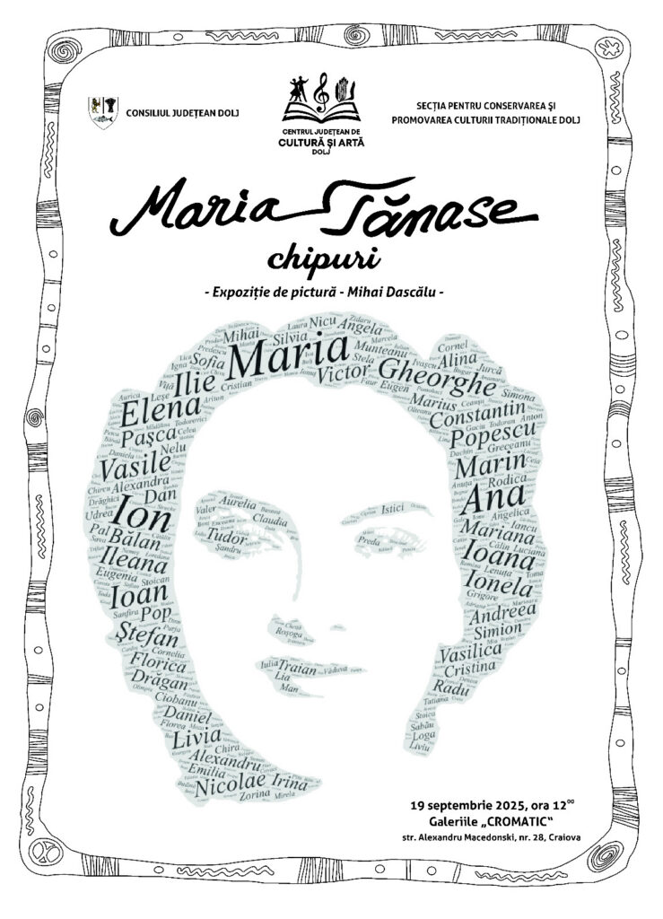 Centrul Județean de Cultură și Artă Dolj – Secția pentru Conservarea şi Promovarea Culturii Tradiționale Dolj vernisează vineri, 19 septembrie 2025, ora 12:00, în Galeriile „Cromatic“, expoziția „Maria Tănase – chipuri“, semnată Mihai Dascălu.