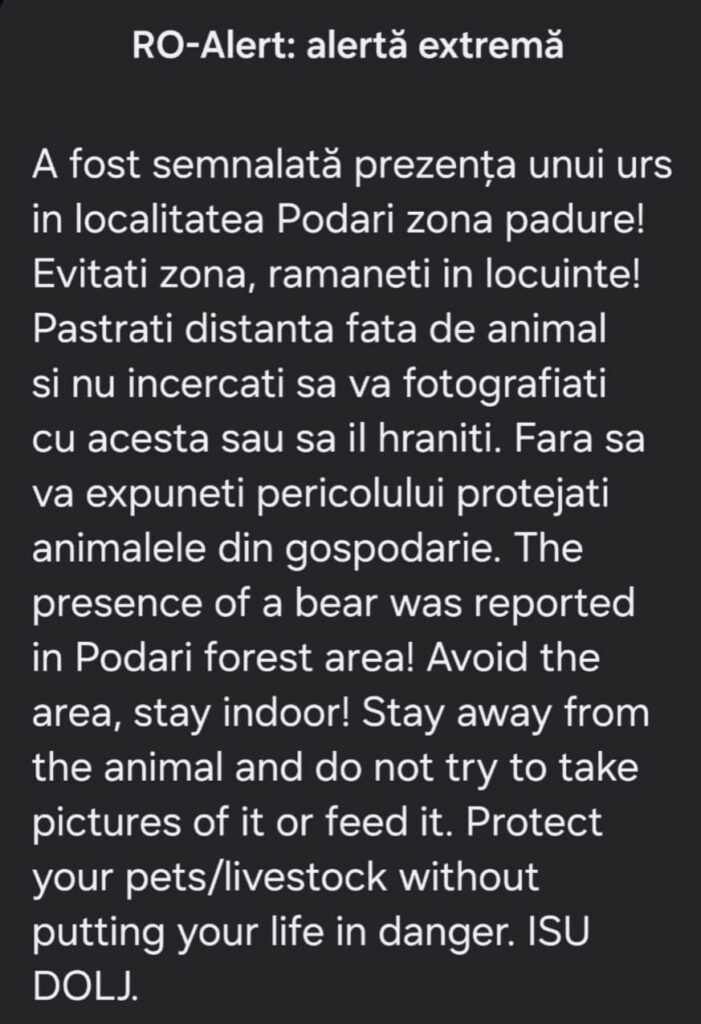 Este alertă la Podari, Dolj. A fost semnalată prezența unui urs. Un echipaj de jandarmi și o ambulanță SMURD se deplasează la fața locului.