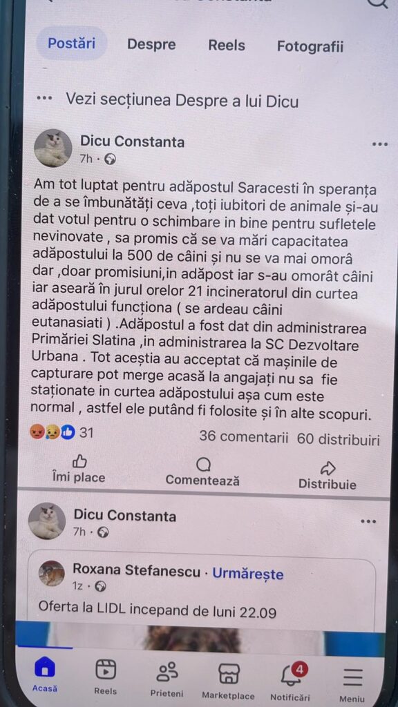 „Am tot luptat pentru adăpostul Sărăcesti, în speranţa de a se îmbunătăți ceva, toți iubitorii de animale şi-au dat votul pentru o schimbare în bine pentru sufletele nevinovate, s-a promis că se va mări capacitatea adăpostului la 500 de câini și nu se va mai omorî dar, doar promisiuni, în adăpost iar s-au omorât câini iar aseară în jurul orelor 21 incineratorul din curtea adăpostului funcţiona (se ardeau câini eutanasiati). Adăpostul a fost dat din administrarea Primăriei Slatina, în administrarea SC Dezvoltare Urbana. Tot aceştia au acceptat că maşinile de capturare pot merge acasă la angajați, nu să fie staționate în curtea adăpostului aşa cum este normal, astfel ele putând fi folosite şi în alte scopuri”, a transmis aceasta.