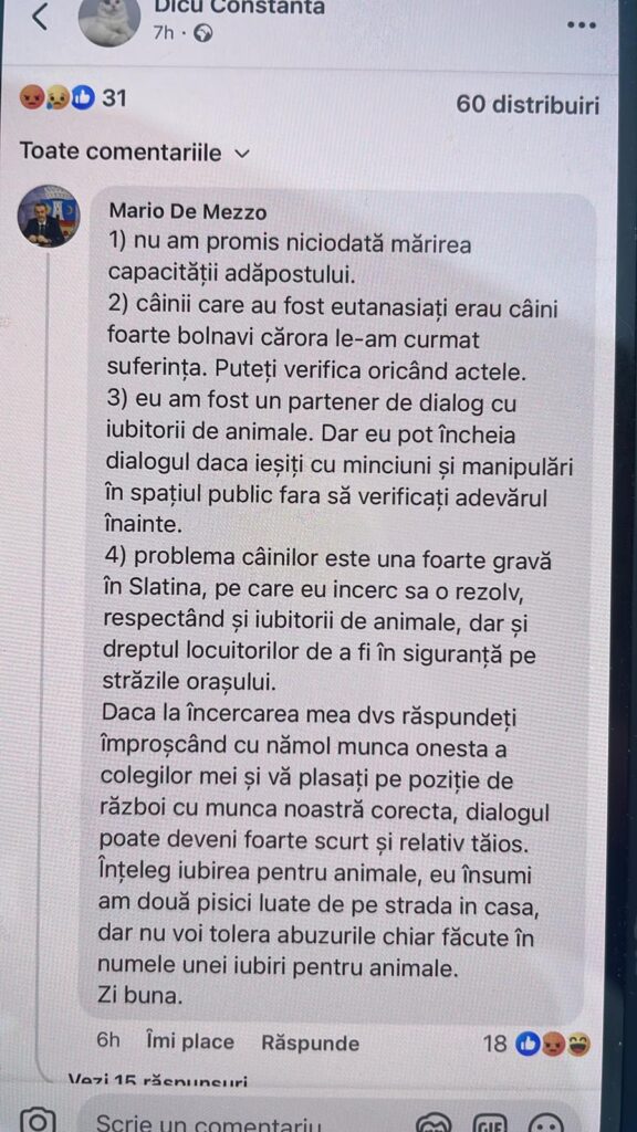 Printr-un comentariu la postarea Constanţei Dicu, primarul Mario De Mezzo respinge acuzațiile privind adăpostul de câini. Mai mult, el susține că nu a promis mărirea capacității şi că eutanasierea a vizat doar animale foarte bolnave.