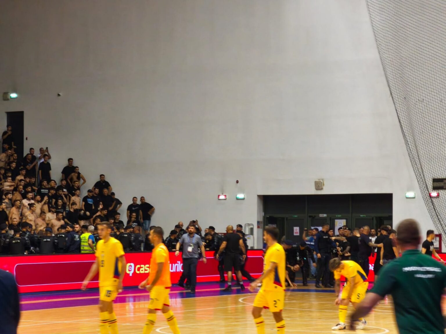 Partida de futsal dintre România și Ungaria, disputată la Craiova, a fost întreruptă zeci de minute după incidente grave provocate de suporteri. Peluza Sud Craiova a fost activă cu mult înainte de meci, scrie fanatik.ro, iar conflictul din tribune a degenerat până la pătrunderea pe suprafața de joc a unor fani.
