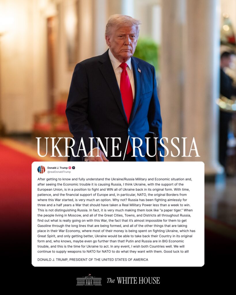 Președintele american Donald Trump a împărtăşit în social media ceea ce pare a fi o schimbare majoră în poziţia sa faţă de războiul din Ucraina şi ce s-ar putea întâmpla dacă şi când luptele se vor încheia. Trump afirmă acum că ucrainenii, sprijiniți de Uniunea Europeană, sunt „în măsură să lupte şi să recâştige întreaga Ucraină în forma sa originală”, și că SUA vor furniza în continuare arme către NATO, „să facă ce doreşte cu ele”.