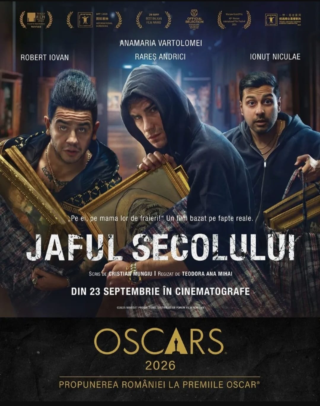 Zilele trecute, filmul românesc „Jaful secolului” a fost lansat la Craiova, la Inspire Cinema Electroputere Mall, în prezența scenografului Cristian Mungiu și a doi dintre actorii din rolurile principale: Robert Iovan, actor al Teatrului Colibri din Craiova (Adrian) și Ionuț Nicolae (Ginel). Cu un afiș care ar face concurență oricărui câștigător, pelicula a fost desemnată să reprezinte România la categoria „Cel mai bun film internațional”, la Premiile Oscar 2026. „Filmul nu va câștiga Oscarul și nu cred că merită să câștige Oscarul”, a declarat scenograful, la întâlnirea cu publicul craiovean.