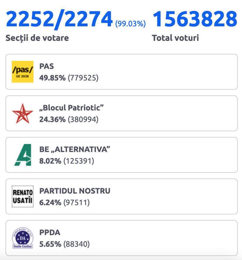 UPDATE: Partidul Acțiune și Solidaritate (fondat de Maia Sandu) a depășit 50% din voturile obținute, după numărarea a 2.264 de secții de votare din totalul de 2.274 (99,56%), potrivit rezultatelor afișate de Comisia Electorală Centrală din Republica Moldova.