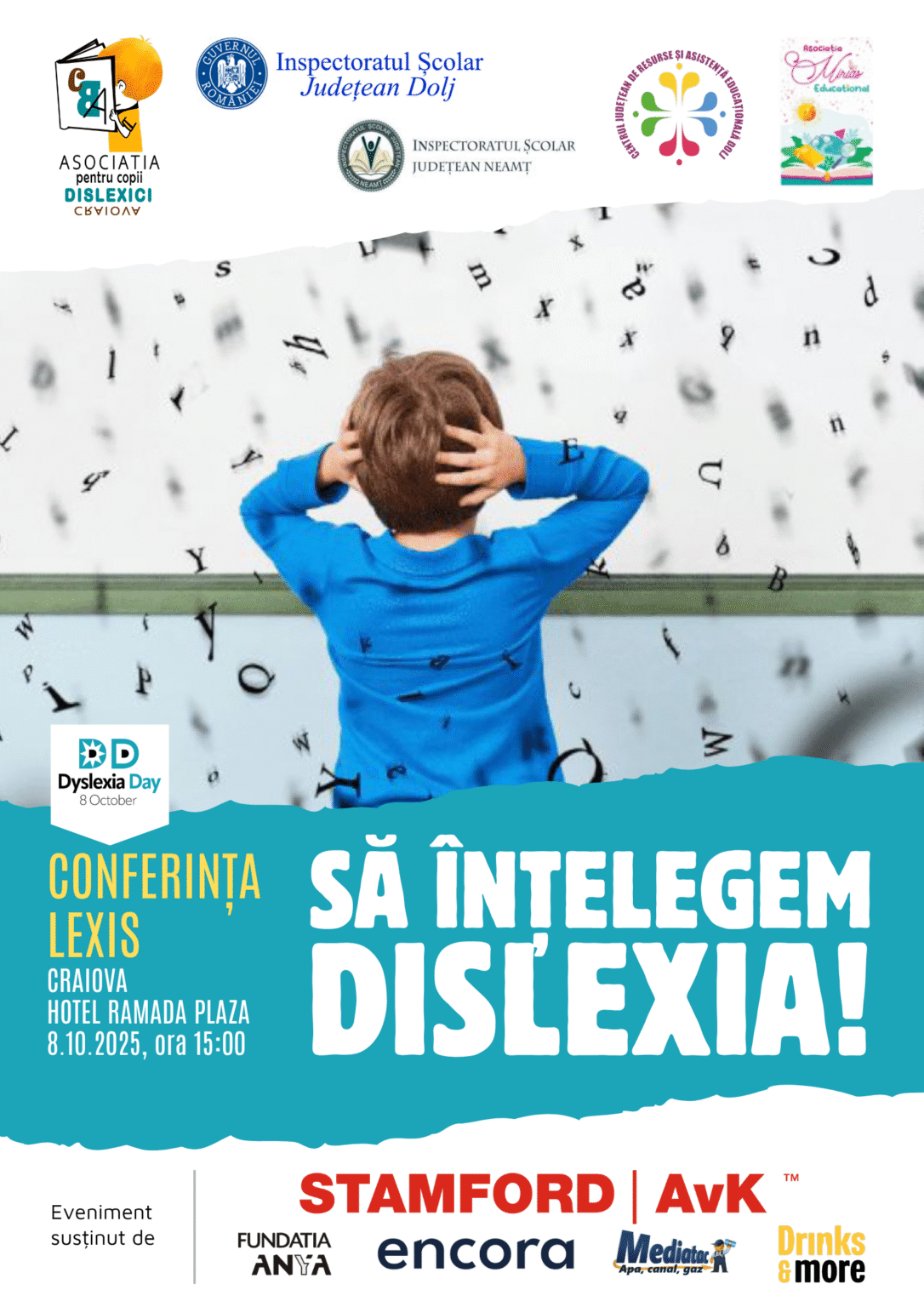 Asociația pentru Copii Dislexici Craiova împreuna cu Asociația MIRIAS Educational organizează ediția a II-a a proiectului DISLEXIA – EDUCAȚIE FĂRĂ BARIERE, în cadrul căreia se va desfășura Conferința LEXIS, un eveniment dedicat înțelegerii și sprijinirii copiilor cu Tulburări Specifice de Învățare (TSI), cu accent pe dislexie. Evenimentul va avea loc în data de 8 octombrie 2025, între orele 15:00–17:30, la Hotel Ramada, Craiova, și reunește experți naționali în educație, psihologie și intervenție terapeutică.