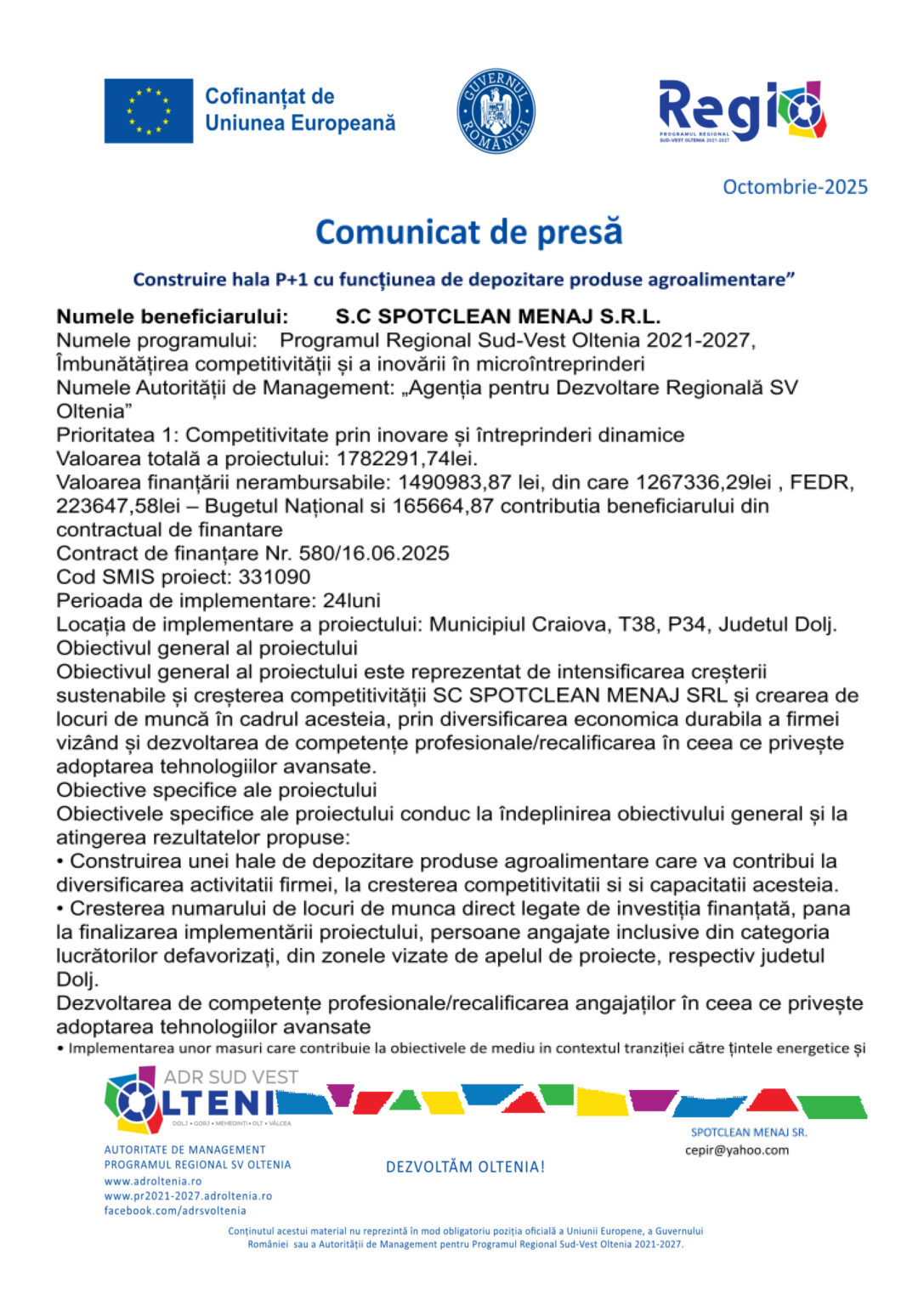 Numele beneficiarului: S.C SPOTCLEAN MENAJ S.R.L.