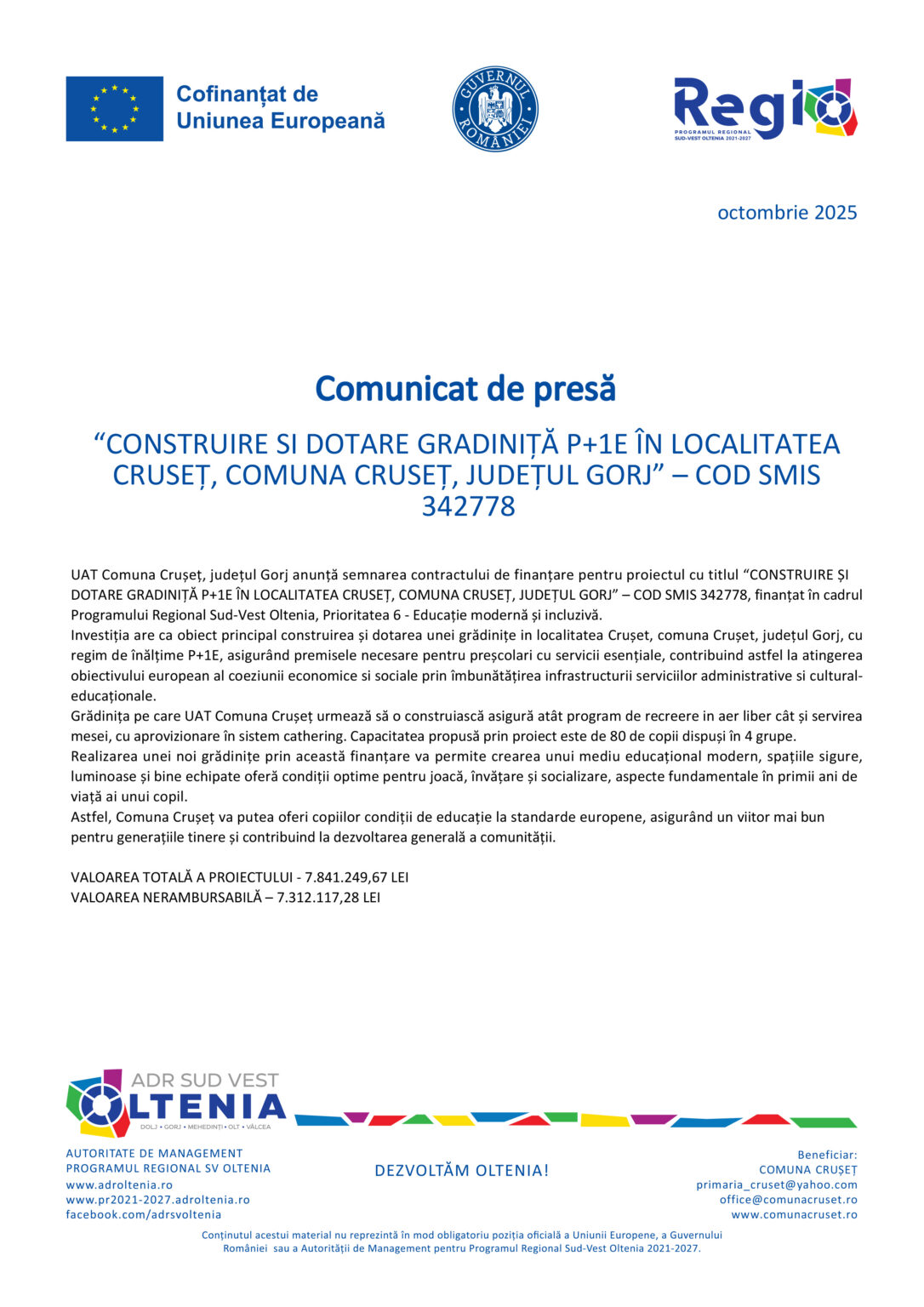 AnunturiComunicat de presă – „Construire și dotare grădiniță P+1E în localitatea Creseț, comuna Cruseț, județul Gorj” Jurnalul Olteniei 6 octombrie 2025 Share #image_title SHARE Jurnalul Olteniei See Full Bio Distribuie acest articol Facebook Whatsapp Whatsapp Email Copy Link Print Articolul precedent Băsescu: PSD-iștii intră în trezorerie și nu mai ies Articolul următor Locuri libere la Atelierele Fabricii de poveşti electroColibri Ultima ora Gorj: agresori reținuți și monitorizați electronic 5 decembrie 2025 Suspect de tentativă de agresiune reținut de Poliția Dolj 5 decembrie 2025 Locuință din Gorj cuprinsă de flăcări 5 decembrie 2025 Distribuție Oltenia: Oltenii, mai interesați de energie și sustenabilitate 5 decembrie 2025 Semimaratonul Craiovei 2025: Record de participanți 5 decembrie 2025 Sancțiuni de peste 40.000 lei și o activitate suspendată la Băbeni 5 decembrie 2025 Oltenia, sub cod galben de vânt. Avertizare ANM 5 decembrie 2025 Lansare proiect: „Împădurirea unui teren agricol în comuna Dobrești, beneficiar SEINEA ILEANA-MIHAELA „ 5 decembrie 2025 Flăcări în toiul nopții la Berislăvești! Pompierii vâlceni au salvat locuința cuprinsă de incendiu 5 decembrie 2025 Un fost jucător de la Universitatea Craiova, inclus în echipa lunii noiembrie, în Liga 2 5 decembrie 2025