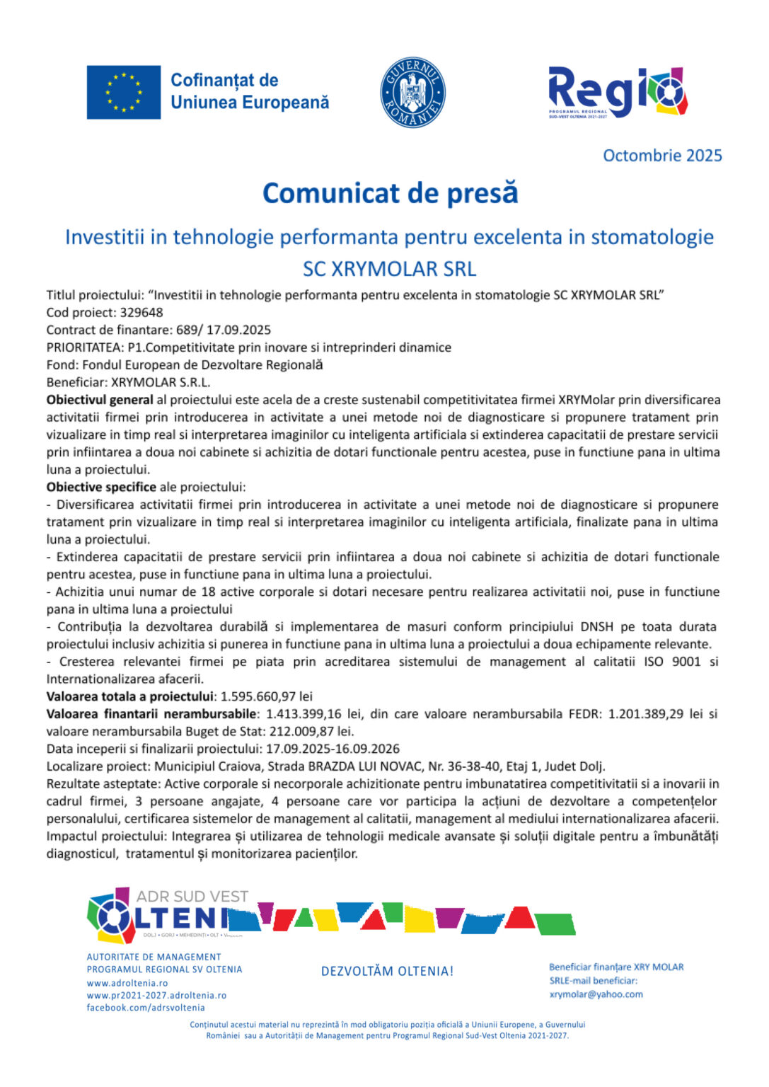 Titlul proiectului: “Investitii in tehnologie performanta pentru excelenta in stomatologie SC XRYMOLAR SRL”