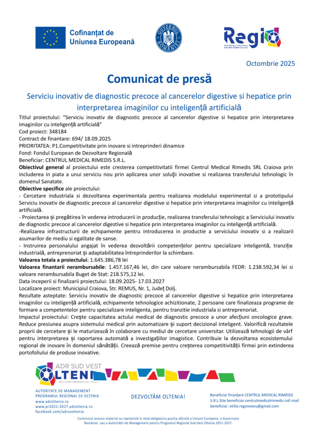 Rezultate asteptate: Serviciu inovativ de diagnostic precoce al cancerelor digestive si hepatice prin interpretarea imaginilor cu inteligență artificială, echipamente tehnologice achizitionate, 2 persoane care finalizeaza programe de formare a competentelor pentru specializare inteligenta, pentru tranzitie industriala si antreprenoriat.