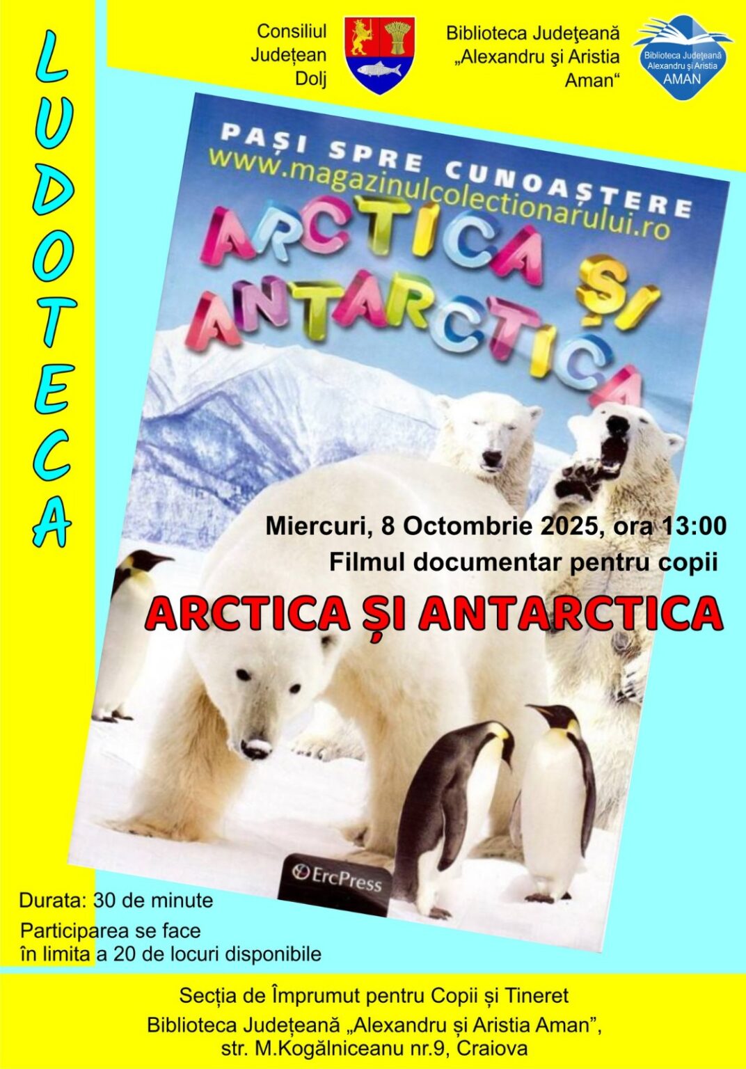 Biblioteca Județeană „Alexandru și Aristia Aman” îi așteaptă astăzi, 8 octombrie, pe cei mici la o activitate educativă și distractivă, organizată la Secția de Împrumut pentru Copii și Tineret – Ludotecă. Începând cu ora 13:00, copiii vor putea viziona filmul documentar „Arctica și Antarctica”, o producție de categorie educațional-documentară, cu o durată de 30 de minute, menită să le ofere o incursiune fascinantă în universul înghețat al celor două regiuni polare ale lumii.