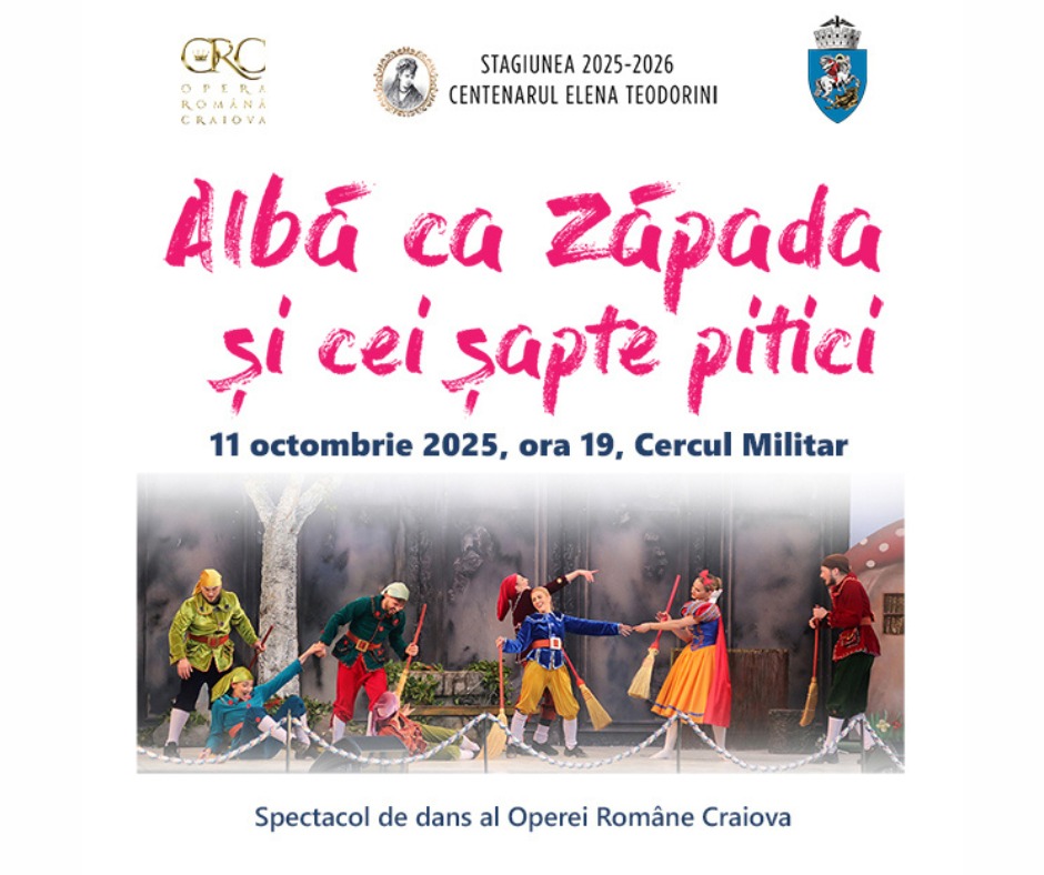 Opera Română Craiova invită publicul la o seară de basm și eleganță, sâmbătă, 11 octombrie 2025, de la ora 19:00, când pe scena Cercului Militar va prinde viață spectacolul de dans „Alba ca Zăpada și cei șapte pitici” – o poveste clasică reinterpretată prin dans, lumină și muzică, o invitație la visare, pe care instituția craioveană o adresează tuturor iubitorilor de frumos.
