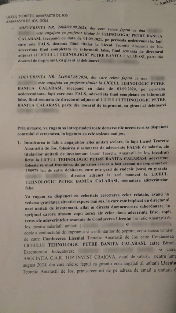 - În calitate de angajator și persoană juridică potențial prejudiciată, Liceul Teoretic Amărăștii de Jos are dreptul și obligația legală de a sesiza organele de cercetare penală cu privire la faptele menționate.”