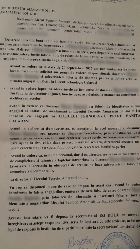 Cazul s-a petrecut la Liceul Teoretic Amărăștii de Jos și la Liceul Tehnologic „Petre Baniță” Călărași, unități în care femeia a predat și a ocupat funcții de conducere. Conducerile școlilor au sesizat Inspectoratul Școlar Județean Dolj (vezi foto), însă instituția a transmis că faptele au caracter penal, nu disciplinar.