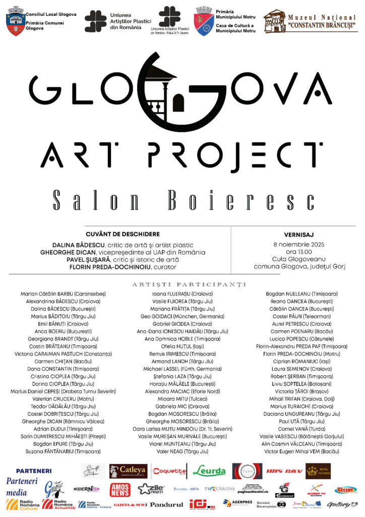 Pe 8 noiembrie 2025, de la ora 13:00, va avea loc vernisajul „Glogova Art Project | Salon Boieresc”, un eveniment cultural de amploare care reunește peste 60 de artiști din România și Germania, într-un dialog vizual între tradiție, patrimoniu și expresie modernă.