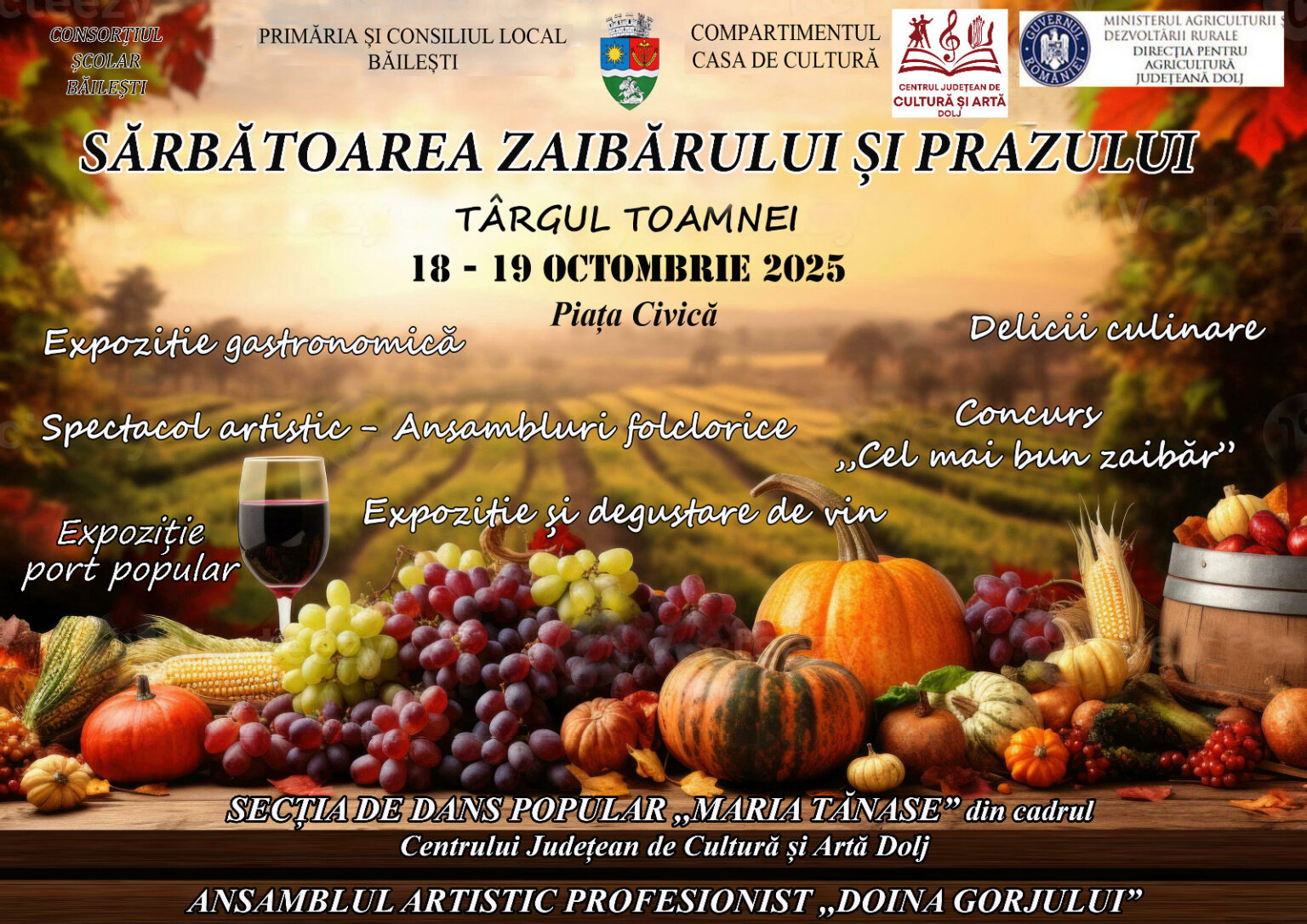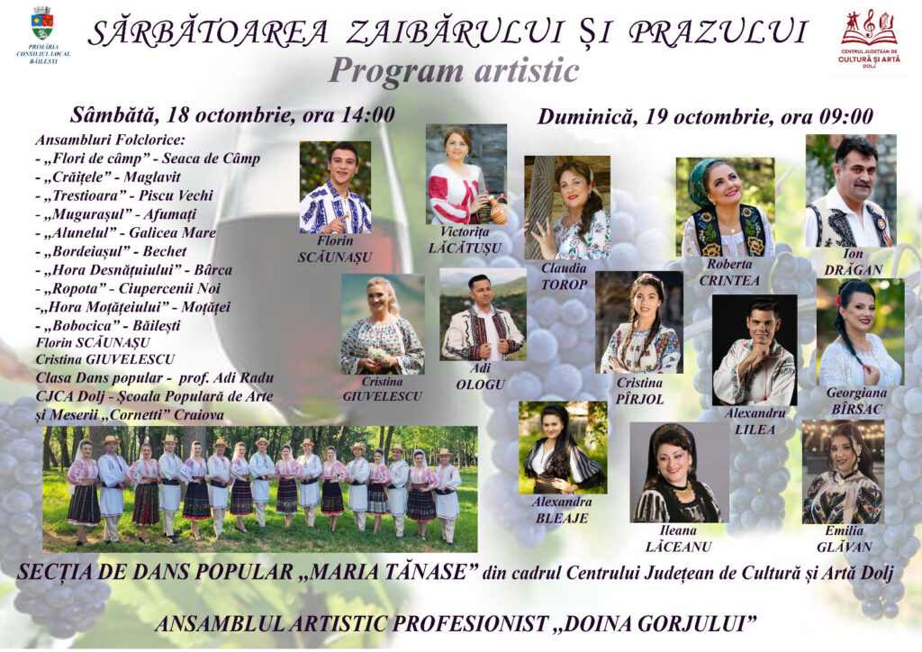 În același timp, va avea loc și „Târgul Toamnei”, organizat de elevii și profesorii școlilor din Băilești, unde vizitatorii vor găsi produse de sezon, aranjamente de toamnă, conserve, dulciuri, decorațiuni și creații artizanale, toate realizate cu talent și pasiune. Pe durata întregului weekend, producătorii locali de zaibăr și cramele din Oltenia vor aduce la Băilești vinurile care definesc această parte de țară și care au devenit, de-a lungul timpului, un adevărat simbol al comunității. Atmosfera de sărbătoare va fi întreținută de zece ansambluri folclorice din întreaga Oltenie, alături de Cristina Giuvelescu și Secția de Dans Popular „Maria Tănase”, Secția Externă de Dans Popular Piscu Vechi – prof.coord.Camelia Popescu și Clasa de Dans popular- prof.coord. Adrian Radu din cadrul Centrului Județean de Cultură și Artă Dolj, care vor aduce pe scenă dansuri și cântece tradiționale pline de energie și culoare. Duminică, 19 octombrie, publicul va fi invitat să participe la un moment de tradiție și mândrie locală – Concursul pentru „Cel mai bun zaibăr”, la care își vor măsura priceperea cei mai talentați producători din regiune. Juriul format din specialiști și invitați va desemna cel mai reușit zaibăr al ediției 2025, premiind calitatea, autenticitatea și gustul autentic oltenesc.