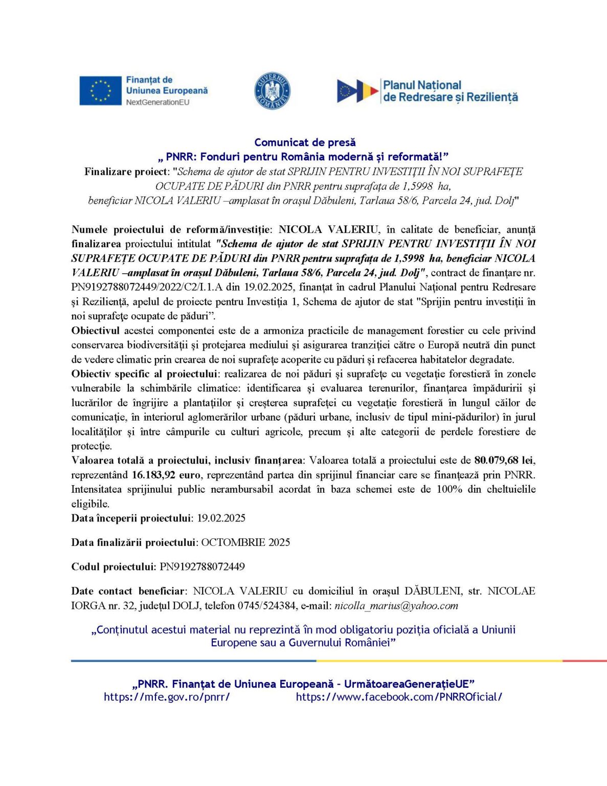 Numele proiectului de reformă/investiție: NICOLA VALERIU, în calitate de beneficiar, anunță finalizarea proiectului intitulat „Schema de ajutor de stat SPRIJIN PENTRU INVESTIȚII ÎN NOI SUPRAFEȚE OCUPATE DE PĂDURI din PNRR pentru suprafața de 1,5998  ha, beneficiar NICOLA VALERIU –amplasat în orașul Dăbuleni, Tarlaua 58/6, Parcela 24, jud. Dolj”, contract de finanțare nr. PN9192788072449/2022/C2/I.1.A din 19.02.2025, finanțat în cadrul Planului Național pentru Redresare și Reziliență, apelul de proiecte pentru Investiția 1, Schema de ajutor de stat „Sprijin pentru investiții în noi suprafeţe ocupate de păduri”.