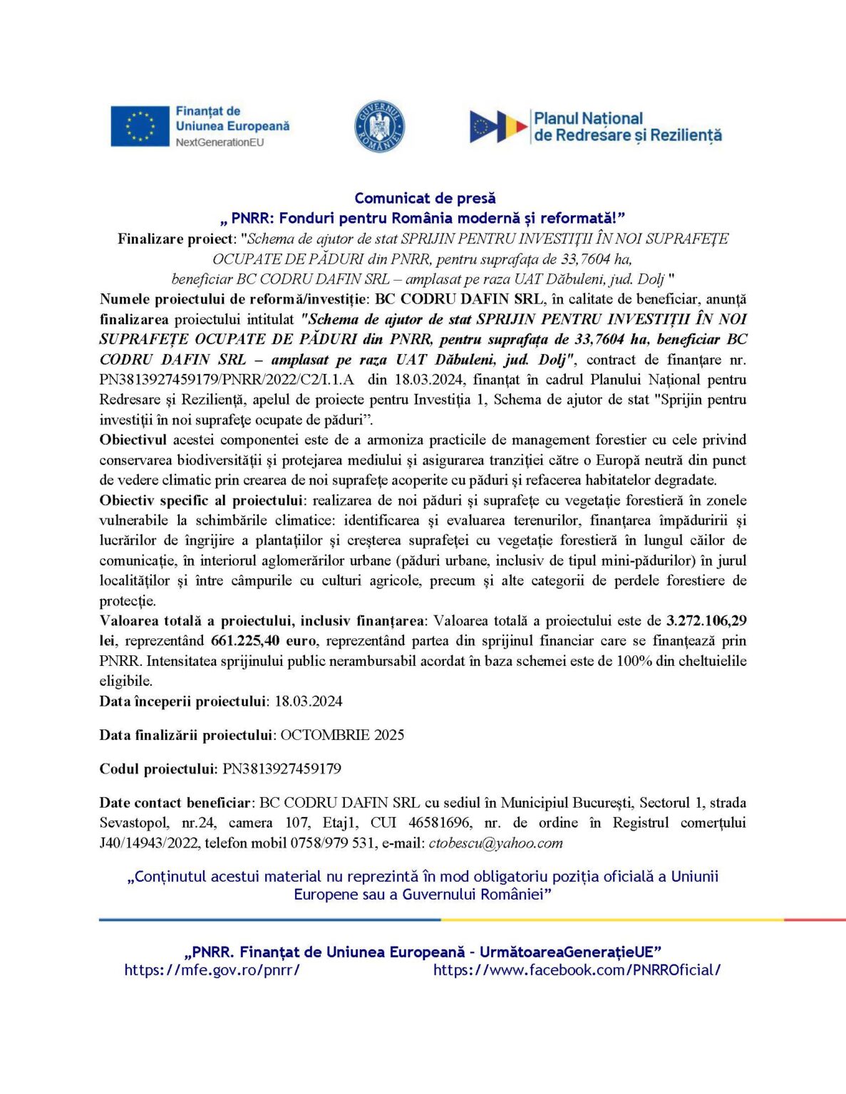 Numele proiectului de reformă/investiție: BC CODRU DAFIN SRL, în calitate de beneficiar, anunță finalizarea proiectului intitulat „Schema de ajutor de stat SPRIJIN PENTRU INVESTIȚII ÎN NOI SUPRAFEȚE OCUPATE DE PĂDURI din PNRR, pentru suprafața de 33,7604 ha, beneficiar BC CODRU DAFIN SRL – amplasat pe raza UAT Dăbuleni, jud. Dolj”, contract de finanțare nr. PN3813927459179/PNRR/2022/C2/I.1.A din 18.03.2024, finanțat în cadrul Planului Național pentru Redresare și Reziliență, apelul de proiecte pentru Investiția 1, Schema de ajutor de stat „Sprijin pentru investiții în noi suprafeţe ocupate de păduri”.