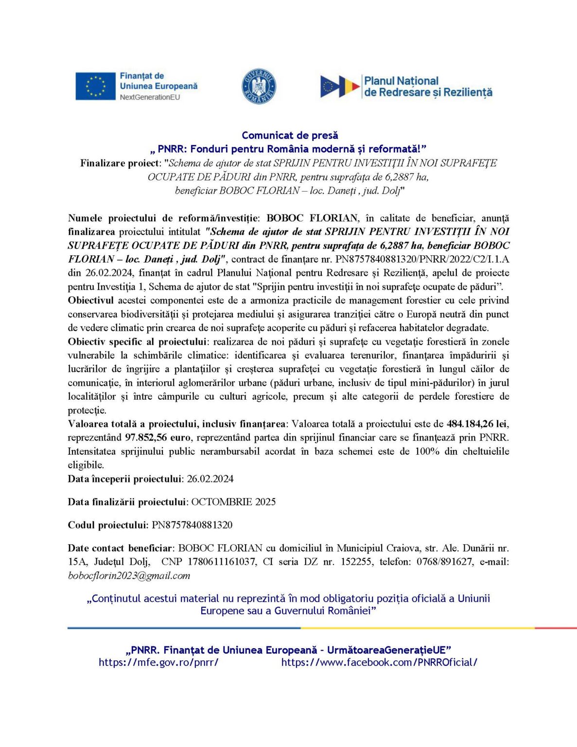 Numele proiectului de reformă/investiție: BOBOC FLORIAN, în calitate de beneficiar, anunță finalizarea proiectului intitulat „Schema de ajutor de stat SPRIJIN PENTRU INVESTIȚII ÎN NOI SUPRAFEȚE OCUPATE DE PĂDURI din PNRR, pentru suprafața de 6,2887 ha, beneficiar BOBOC FLORIAN – loc. Daneți , jud. Dolj”, contract de finanțare nr. PN8757840881320/PNRR/2022/C2/I.1.A din 26.02.2024, finanțat în cadrul Planului Național pentru Redresare și Reziliență, apelul de proiecte pentru Investiția 1, Schema de ajutor de stat „Sprijin pentru investiții în noi suprafeţe ocupate de păduri”.