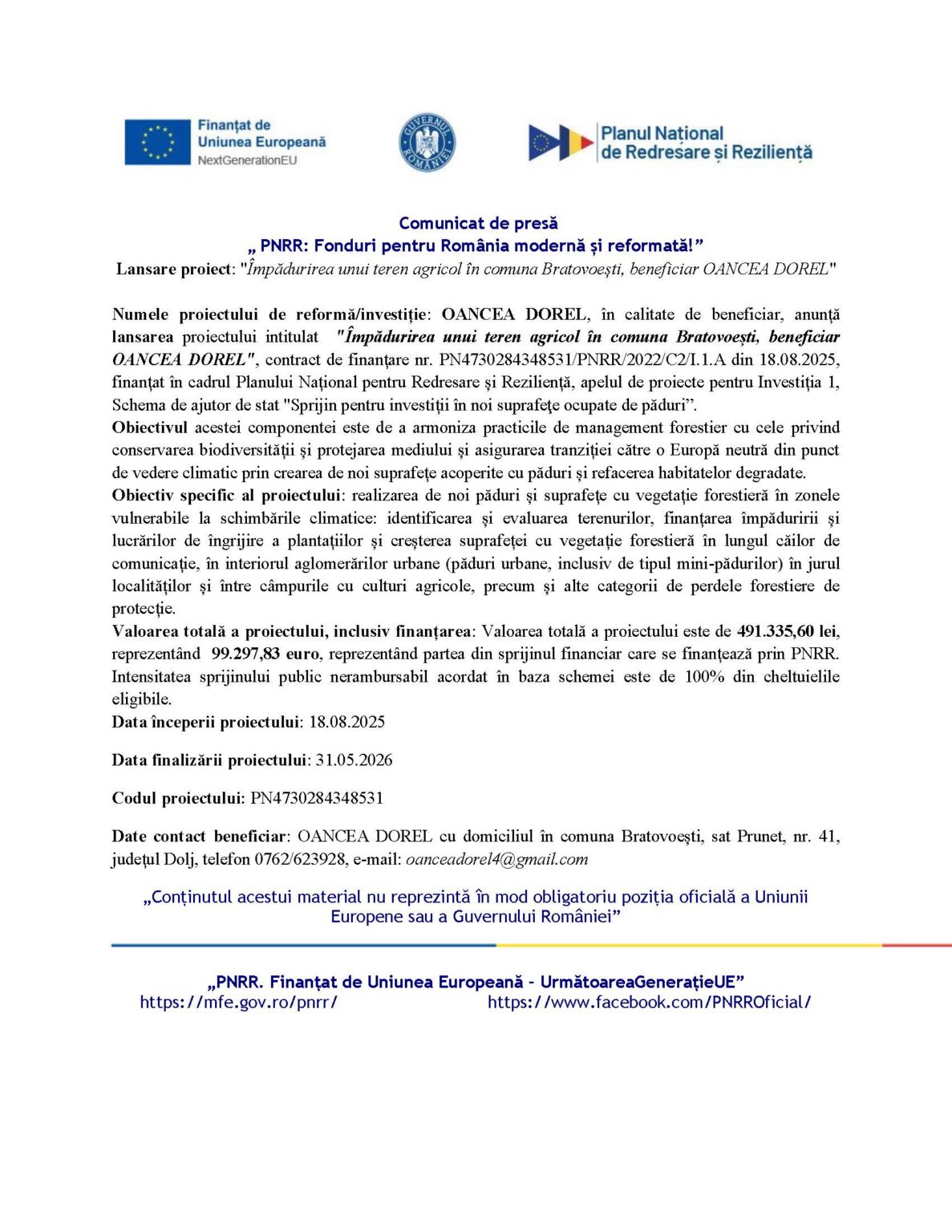 Numele proiectului de reformă/investiție: OANCEA DOREL, în calitate de beneficiar, anunță lansarea proiectului intitulat „Împădurirea unui teren agricol în comuna Bratovoești, beneficiar OANCEA DOREL”, contract de finanțare nr. PN4730284348531/PNRR/2022/C2/I.1.A din 18.08.2025, finanțat în cadrul Planului Național pentru Redresare și Reziliență, apelul de proiecte pentru Investiția 1, Schema de ajutor de stat „Sprijin pentru investiții în noi suprafeţe ocupate de păduri”.