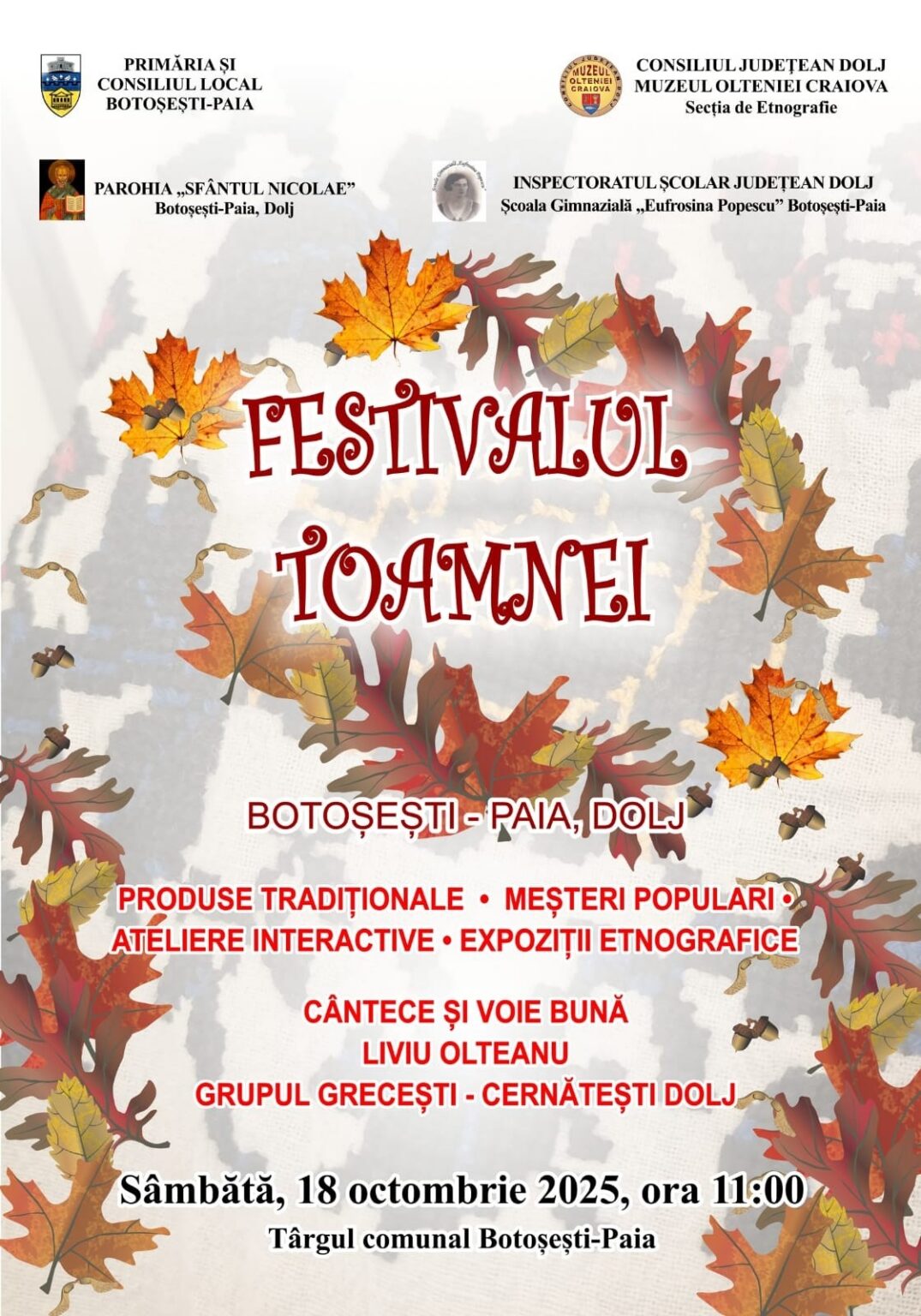 Comuna Botoșești-Paia devine sâmbătă, 18 octombrie 2025, de la ora 11:00, gazda unei sărbători a tradițiilor și a spiritului comunitar – Festivalul Toamnei, un eveniment dedicat obiceiurilor locale, meșteșugurilor și bucuriei de a fi împreună.
