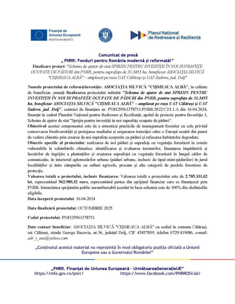 Finalizare proiect: „Schema de ajutor de stat SPRIJIN PENTRU INVESTIȚII ÎN NOI SUPRAFEȚE OCUPATE DE PĂDURI din PNRR, pentru suprafața de 31,3455 ha, beneficiar ASOCIAȚIA SILVICĂ „CIȘMEAUA ALBĂ” – amplasat pe raza UAT Călărași și UAT Sadova, jud. Dolj”