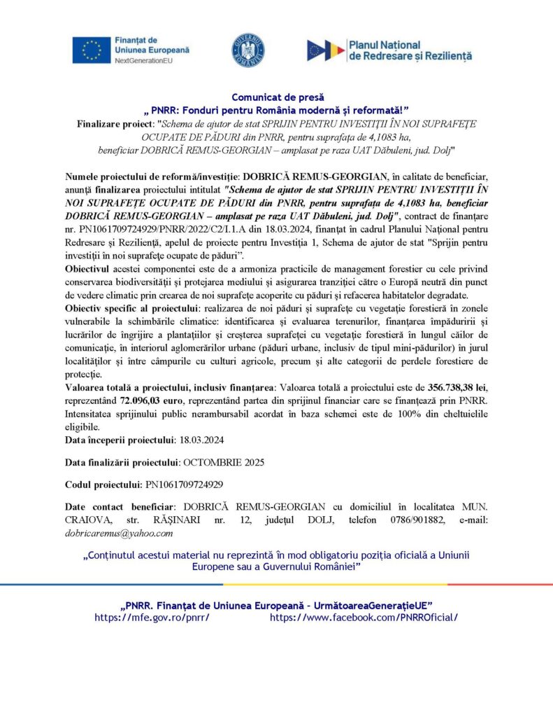PNRR: Fonduri pentru România modernă și reformată! Finalizare proiect: „Schema de ajutor de stat SPRIJIN PENTRU INVESTIȚII ÎN NOI SUPRAFEȚE OCUPATE DE PĂDURI din PNRR, pentru suprafața de 4,1083 ha,beneficiar DOBRICĂ REMUS-GEORGIAN – amplasat pe raza UAT Dăbuleni, jud. Dolj”