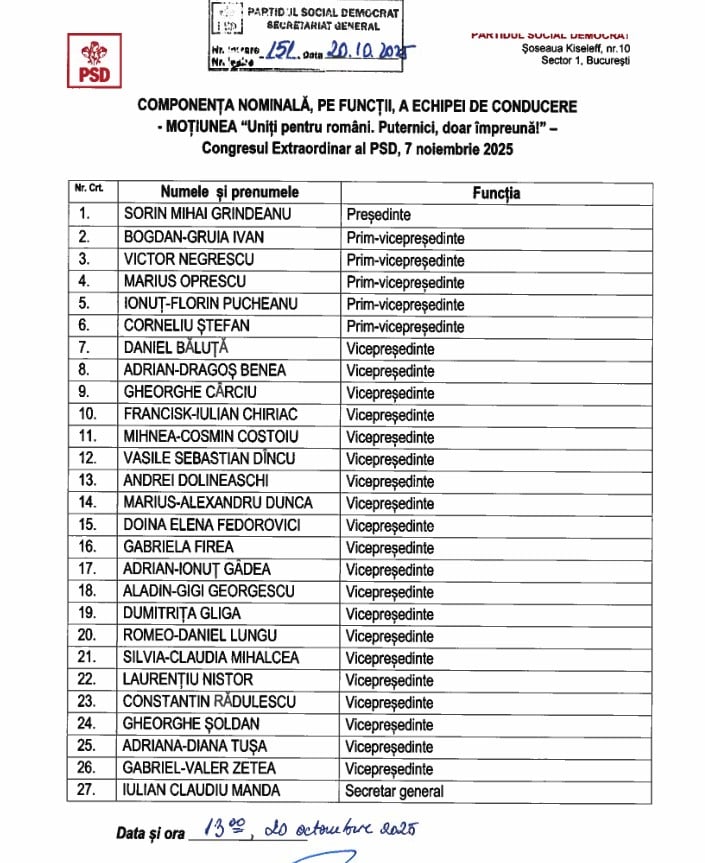 PSD își va alege noul președinte pe 7 noiembrie, iar Sorin Grindeanu este singurul înscris în cursa pentru șefia partidului. Printre numele care vor face parte din echipa lui Sorin Grindeanu se numără europarlamentarul Claudiu Manda, Gabriela Firea sau Daniel Băluță, primarul Sectorului 4. Din Oltenia, la conducerea partidului ar urma să fie prezenți Marius Oprescu, Constantin Rădulescu și Aladin Georgescu
