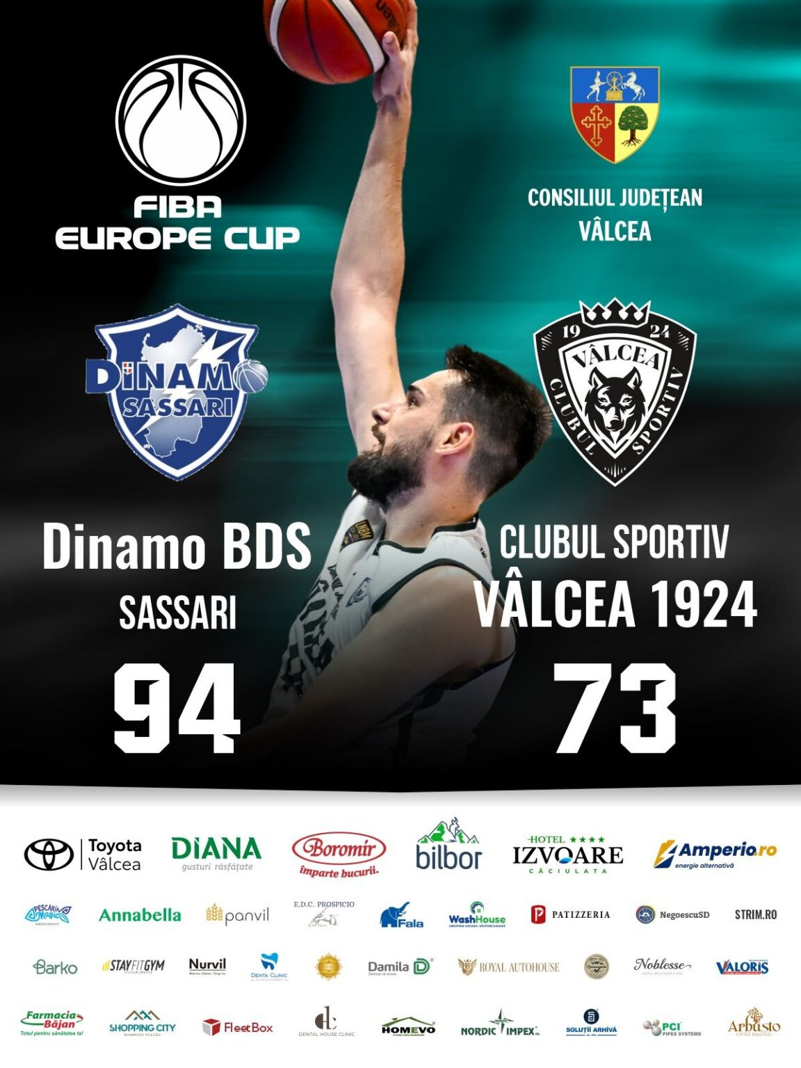 CS Vâlcea 1924 a suferit miercuri seara a doua înfrângere consecutivă din Grupa G a FIBA Europe Cup, pierzând în deplasare, la Dinamo Sassari, cu scorul de 94–73. Formația antrenată de Arturo Álvarez a ținut pasul trei sferturi cu experimentata echipă italiană, însă finalul a aparținut gazdelor. Meciul a început într-un ritm ridicat, ambele echipe marcând constant. Sassari s-a impus în primul sfert cu 30–27, dar vâlcenii au răspuns excelent în cel de-al doilea, câștigat cu 20–17.