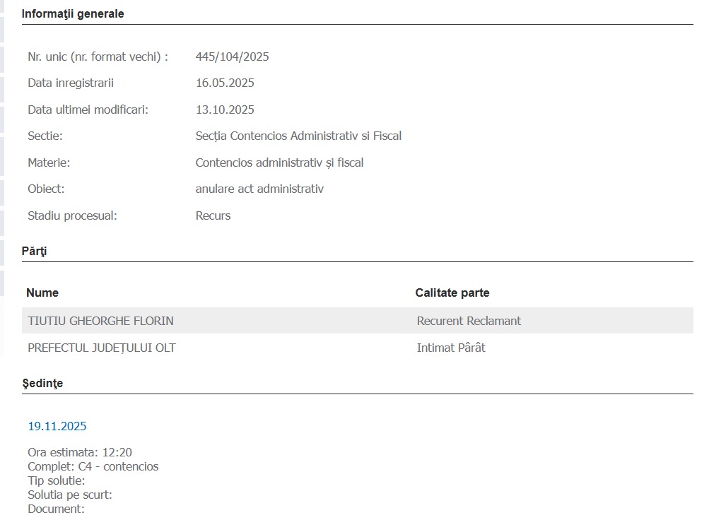 Tribunalul Olt a respins acțiunea în instanță a fostului edil și cererea sa de suspendare a ordinului administrativ emis în 13 martie 2025, decizia fiind definitivă. Instanța a constatat că ordinul prefectului are temei legal, întrucât Tiutiu, ales pe lista PSD, și-a pierdut calitatea de membru al acestui partid în momentul în care a semnat adeziunea la PNL. Schimbarea formațiunii politice este interzisă prin lege pentru primari în timpul mandatului, iar încălcarea acestei prevederi duce la pierderea automată a funcției.