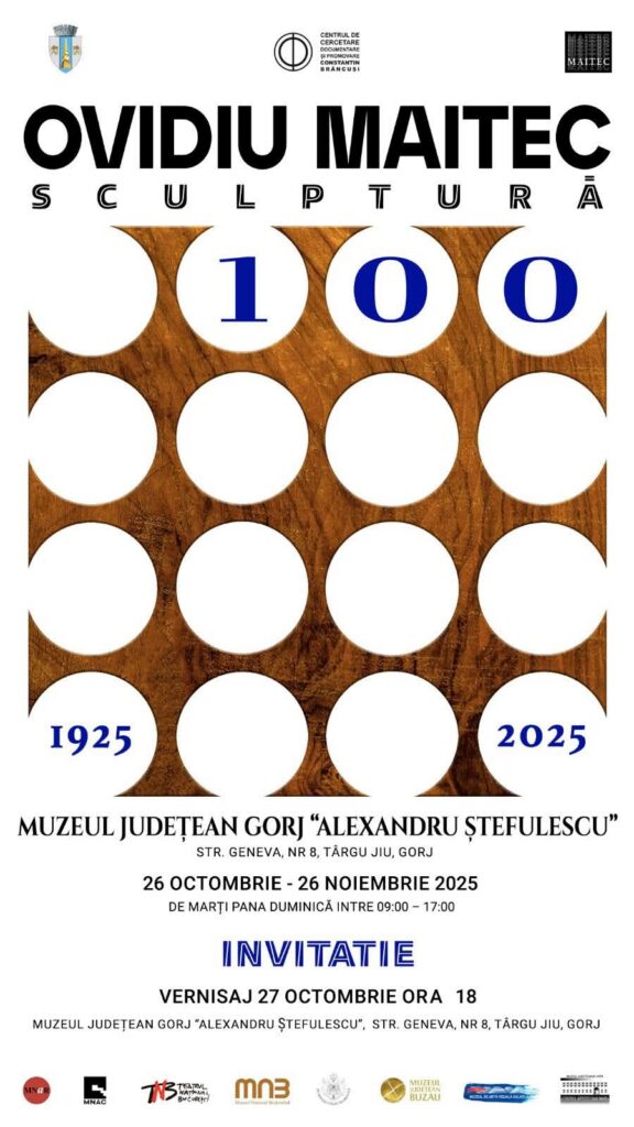 Tot la muzeu, de la ora 18:00, va fi vernisată expoziția de sculptură „Ovidiu Maitec 100”, curatoriată de Irina Ungureanu Sturza, cu prezentarea criticului de artă Cătălin Davidescu. Evenimentul marchează centenarul nașterii marelui sculptor Ovidiu Maitec (1925–2025), considerat unul dintre continuatorii dialogului artistic inițiat de Brâncuși între formă, lumină și expresie.