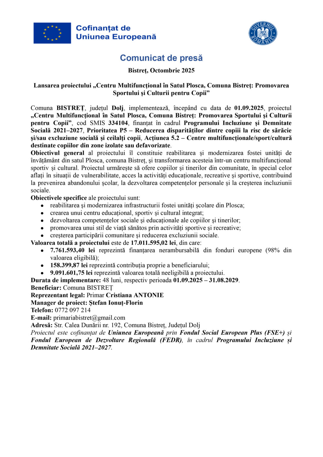 Comuna BISTREȚ, județul Dolj, implementează, începând cu data de 01.09.2025, proiectul „Centru Multifuncțional în Satul Plosca, Comuna Bistreț: Promovarea Sportului și Culturii pentru Copii”, cod SMIS 334104, finanțat în cadrul Programului Incluziune și Demnitate Socială 2021–2027, Prioritatea P5 – Reducerea disparităților dintre copiii la risc de sărăcie și/sau excluziune socială și ceilalți copii, Acțiunea 5.2 – Centre multifuncționale/sport/cultură destinate copiilor din zone izolate sau defavorizate.
