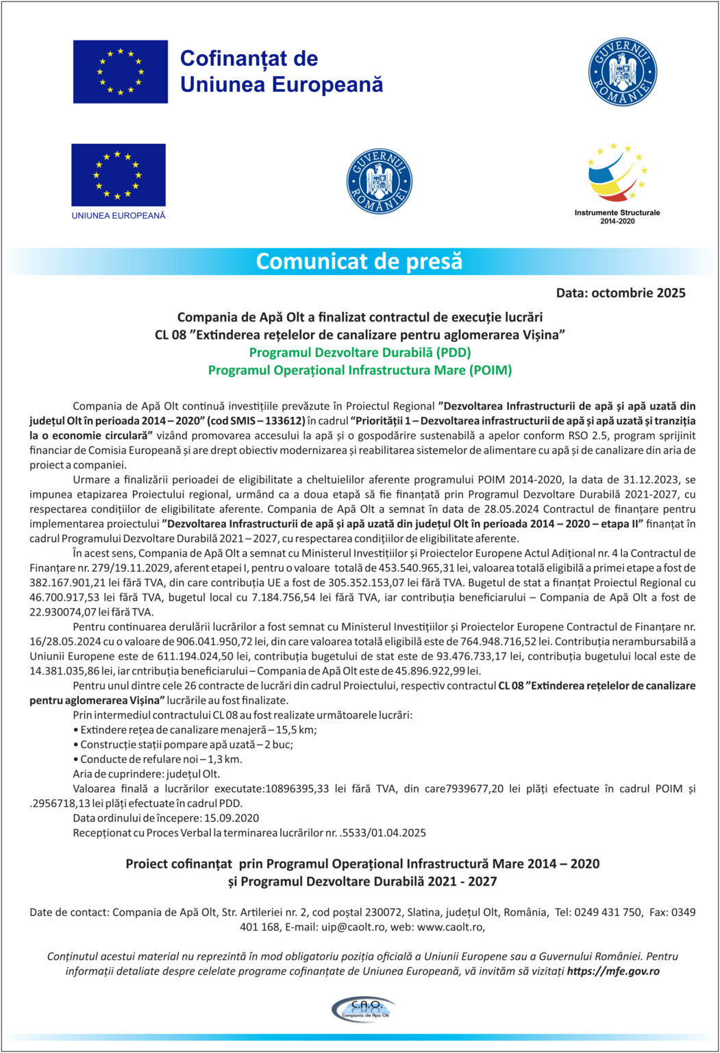 AnunturiCompania de Apă Olt a finalizat contractul de execuție lucrări CL 08 „Extinderea rețelelor de canalizare pentru aglomerația Vișina” Jurnalul Olteniei 31 octombrie 2025 Share SHARE Programul Dezvoltare Durabilă (PDD)Programul Operațional Infrastructură Mare (POIM) Jurnalul Olteniei See Full Bio Distribuie acest articol Facebook Whatsapp Whatsapp Email Copy Link Print Articolul precedent ANUNT PRIVIND AFISAREA PUBLICA A DOCUMENTELOR TEHNICE ALE CADASTRULUI Articolul următor Compania de Apă Olt a finalizat contractul de proiectare și execuție lucrări CL 02 „Extindere facilități de depozitare nămol tratat și reabilitare infrastructură transfer apă uzată către SEAU” Ultima ora Dolj: Ajutoare sociale de peste 76 milioane lei 5 decembrie 2025 Cea de-a VII-a ediție a Semimaratonului Craiovei a avut loc sâmbătă, 18 octombrie 2025. 5 decembrie 2025 ANUNT PRIVIND ORGANIZAREA ACHIZITIEI DE UTILAJE . MINIEXCAVATOR – LOTUL 1, UTILAJ DE FORAT HIDRAULIC – LOTUL 2 – RELUATÃ 2 5 decembrie 2025 Modernizarea CF Filiași: Începe proiectarea 5 decembrie 2025 Testare gratuită HPV la Spitalul Județean Târgu Jiu 5 decembrie 2025 CE Oltenia raportează emisii scăzute de dioxid de carbon 5 decembrie 2025 DIICOT a destructurat un grup de proxenetism în Mehedinți 5 decembrie 2025 Legea pensiilor magistraților, atacată, din nou, la CCR 5 decembrie 2025 Magia Crăciunului Târgu Jiu: Seară de neuitat 5 decembrie 2025 A dat bancnote false cu „Prop Copy”: Percheziții în Mehedinți 5 decembrie 2025
