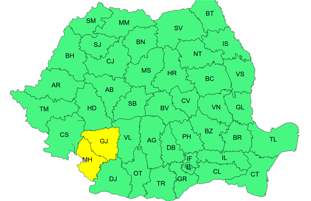 Administrația Națională de Meteorologie (ANM) a emis, vineri, o atenționare Cod galben de ploi importante cantitativ, valabilă până duminică dimineața în județele Gorj și Mehedinți, precum și o informare de vânt și precipitații mixte, ce vizează arii mai extinse.
